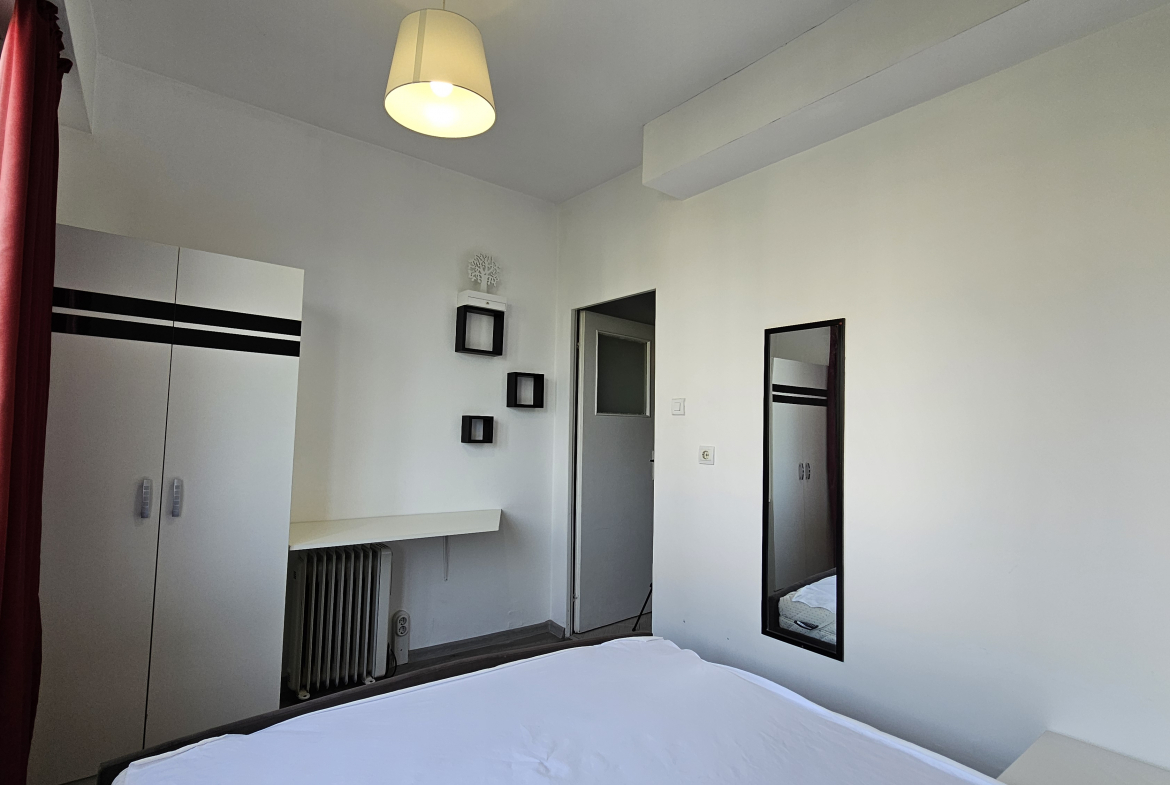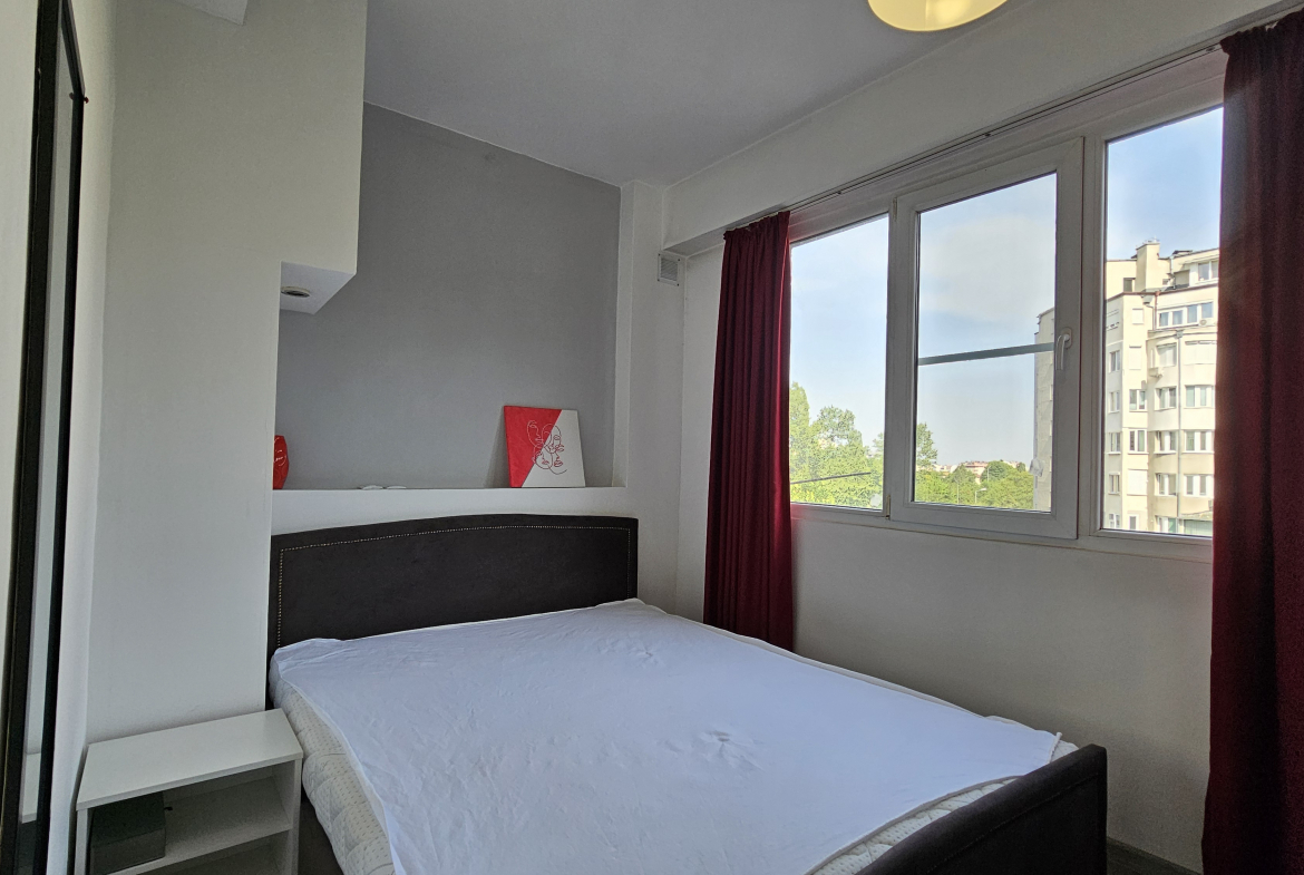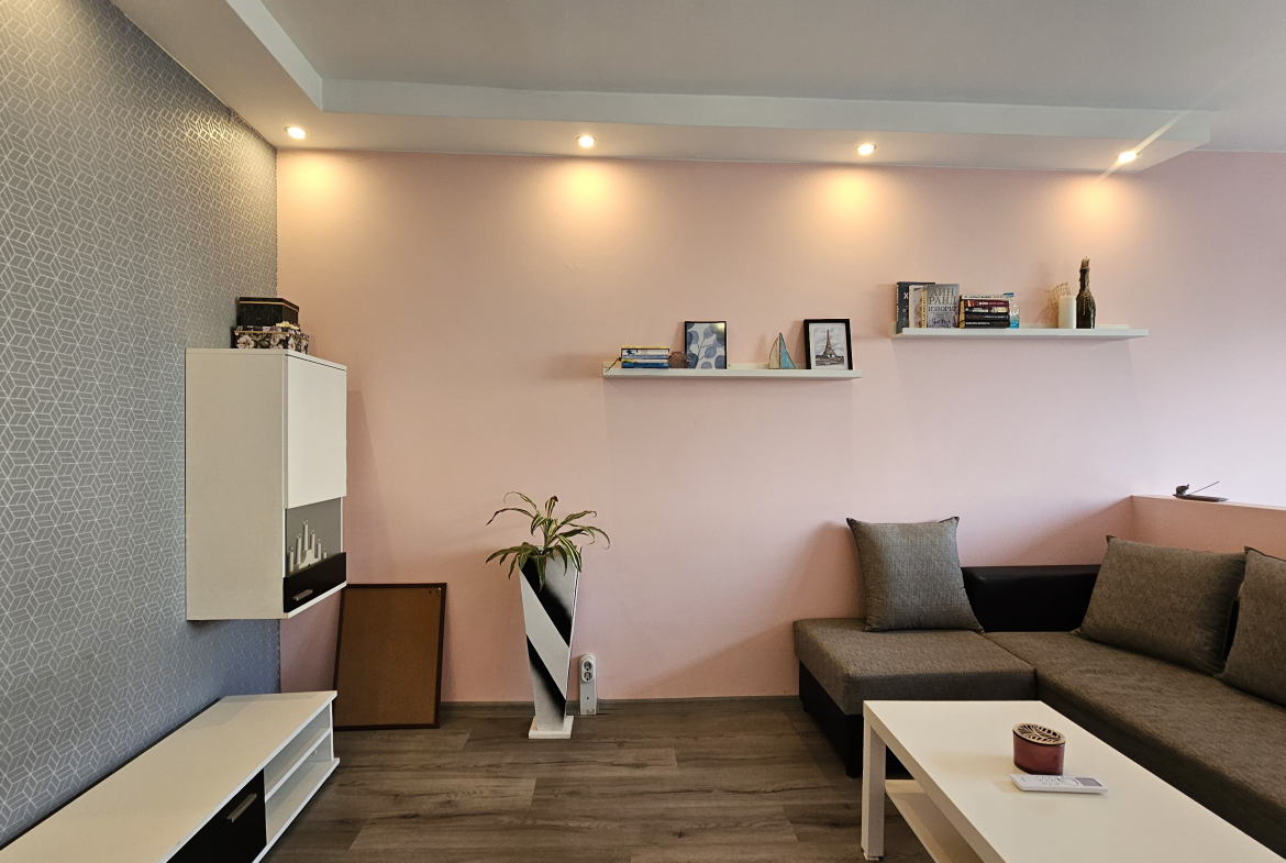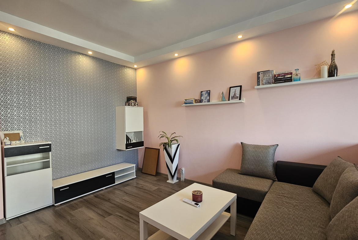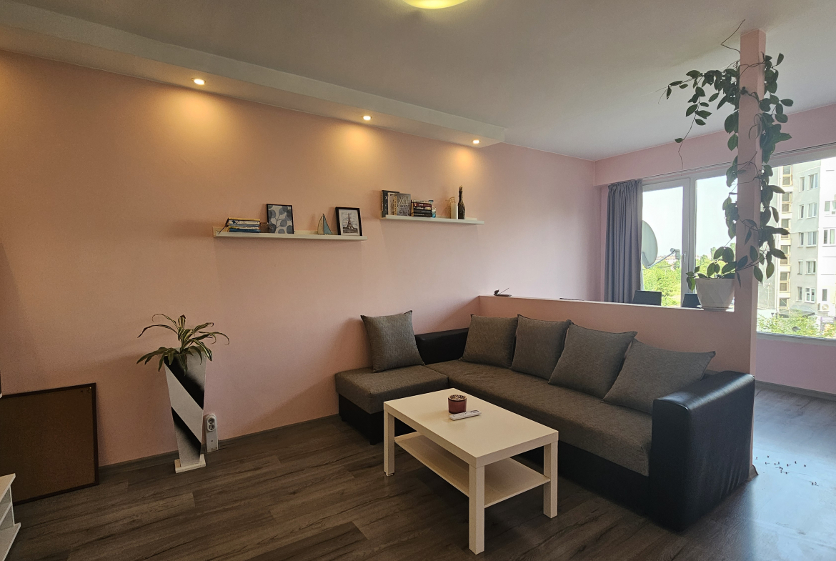 Neat and bright two-room apartment in a convenient location near the metro station in the city center. Lyulin 1. With an area of 50 square meters, the apartment is functionally divided into: a spacious living room, a fully equipped kitchenette, a cozy bedroom, equipped with a large mirror and a functional wardrobe, and a bathroom with a toilet.