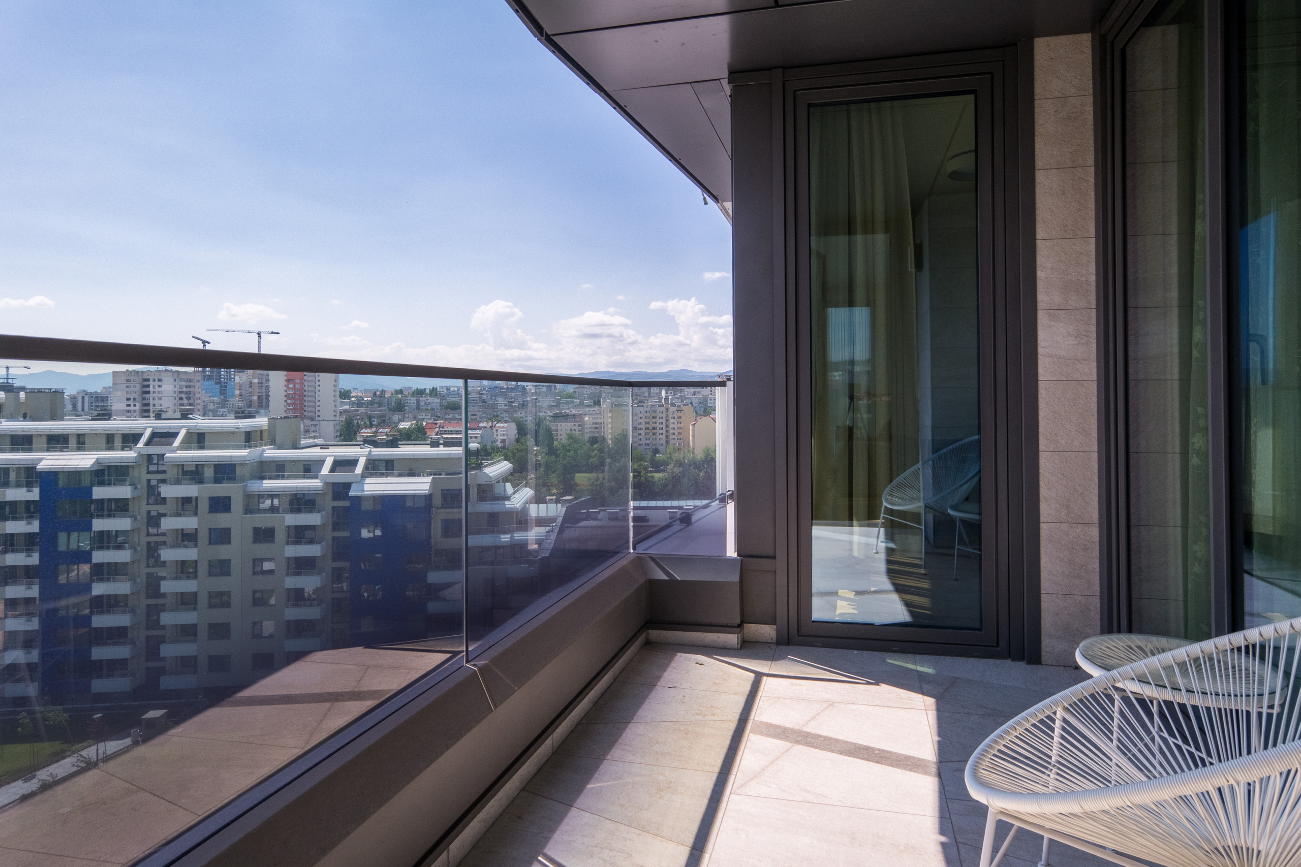 The apartment has a net area of 107 sq.m., functionally distributed into: a spacious living room with kitchen and dining room, 2 bedrooms, 1 bathroom with toilet and 1 separate toilet. The apartment also has a nice terrace with panoramic views of the city, as well as an option to rent a garage for €100/month. Central heating and luxurious common areas – Arteks construction. Building maintenance fee - 92 EUR/ 180 BGN.