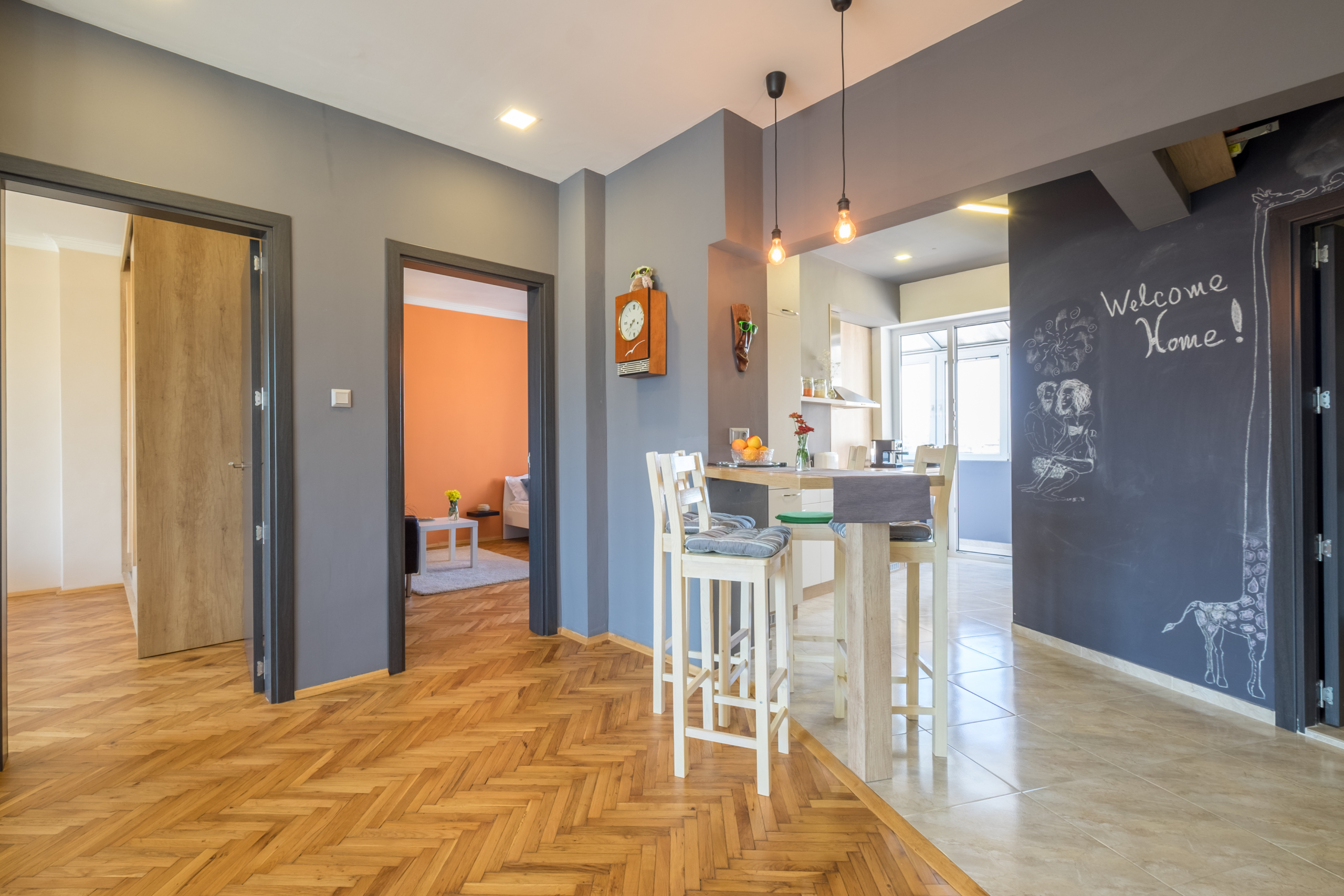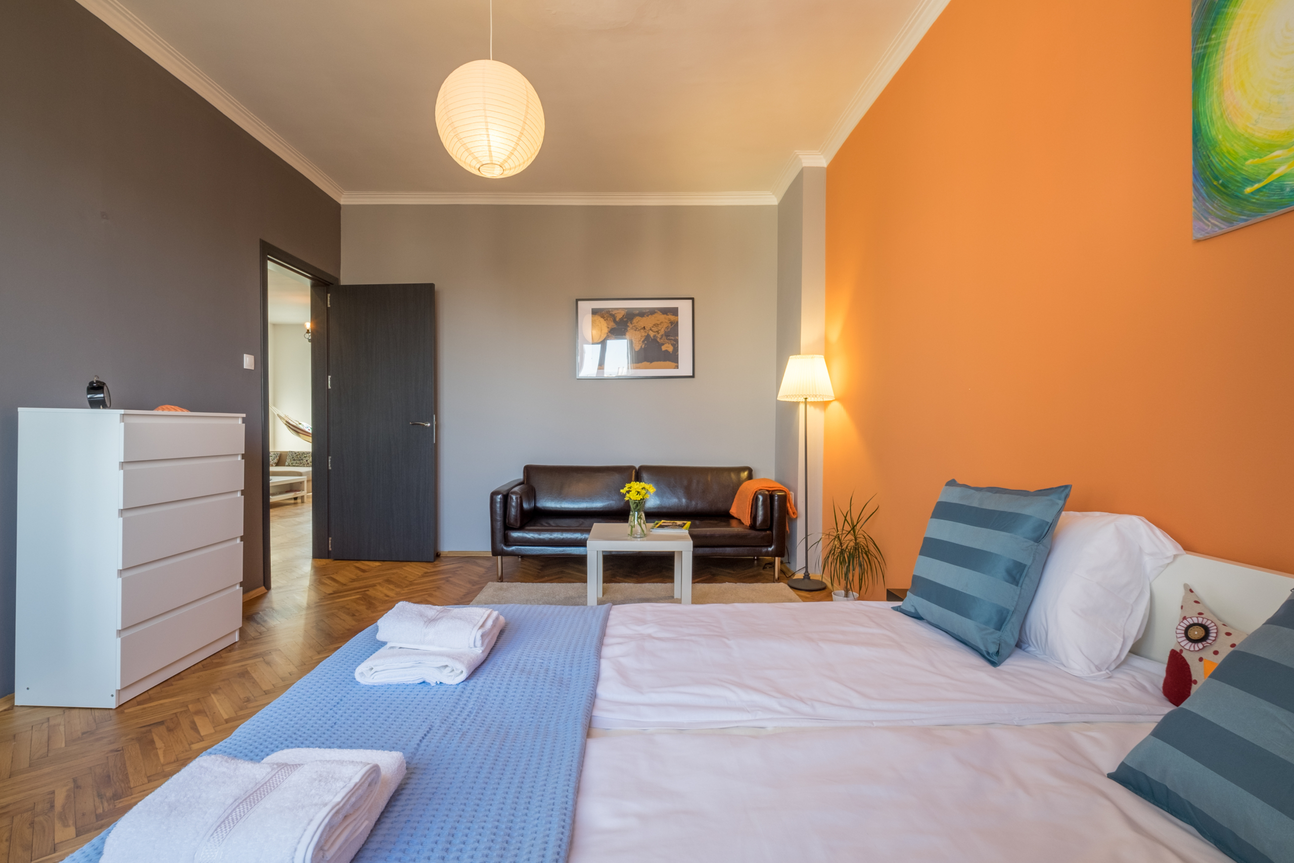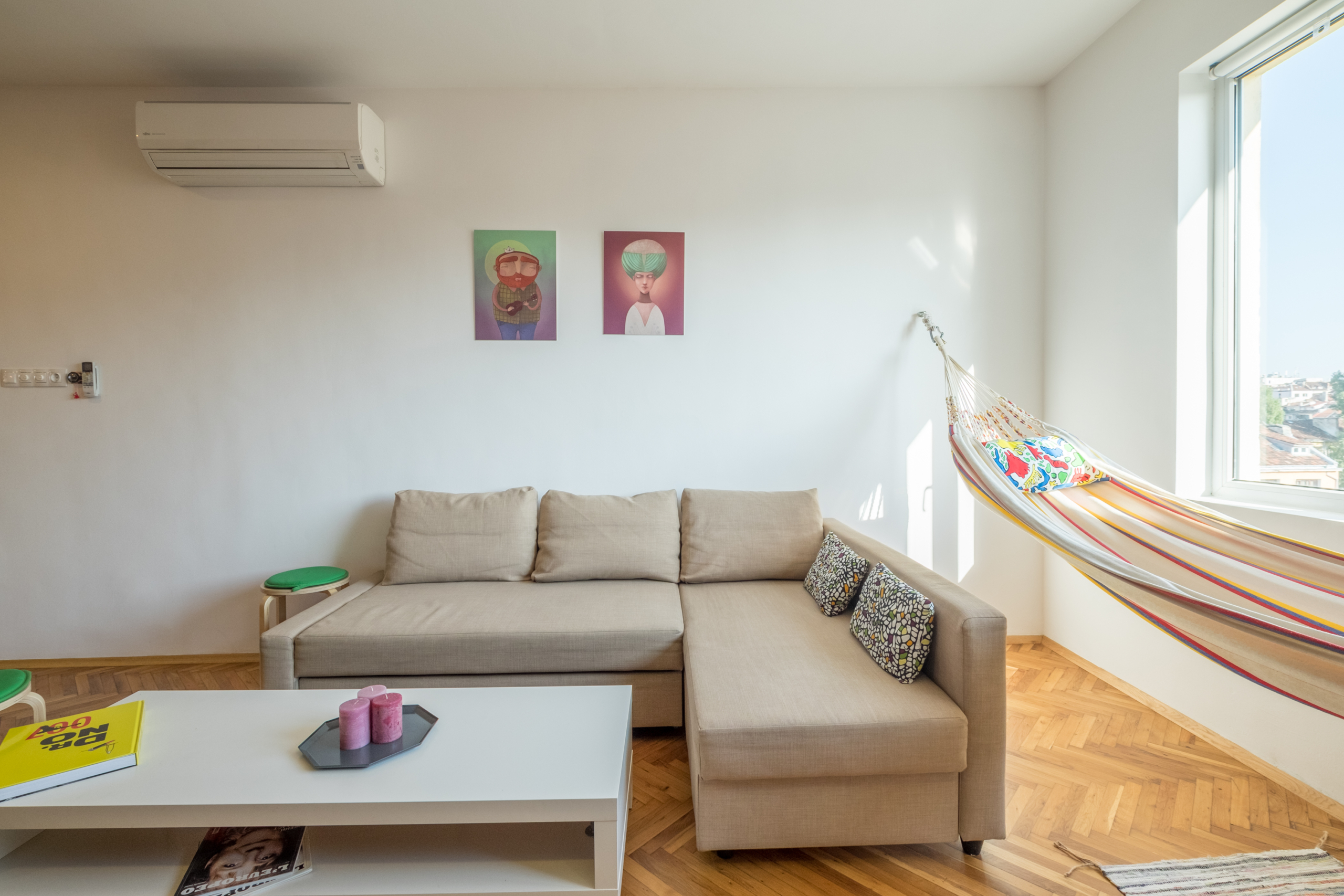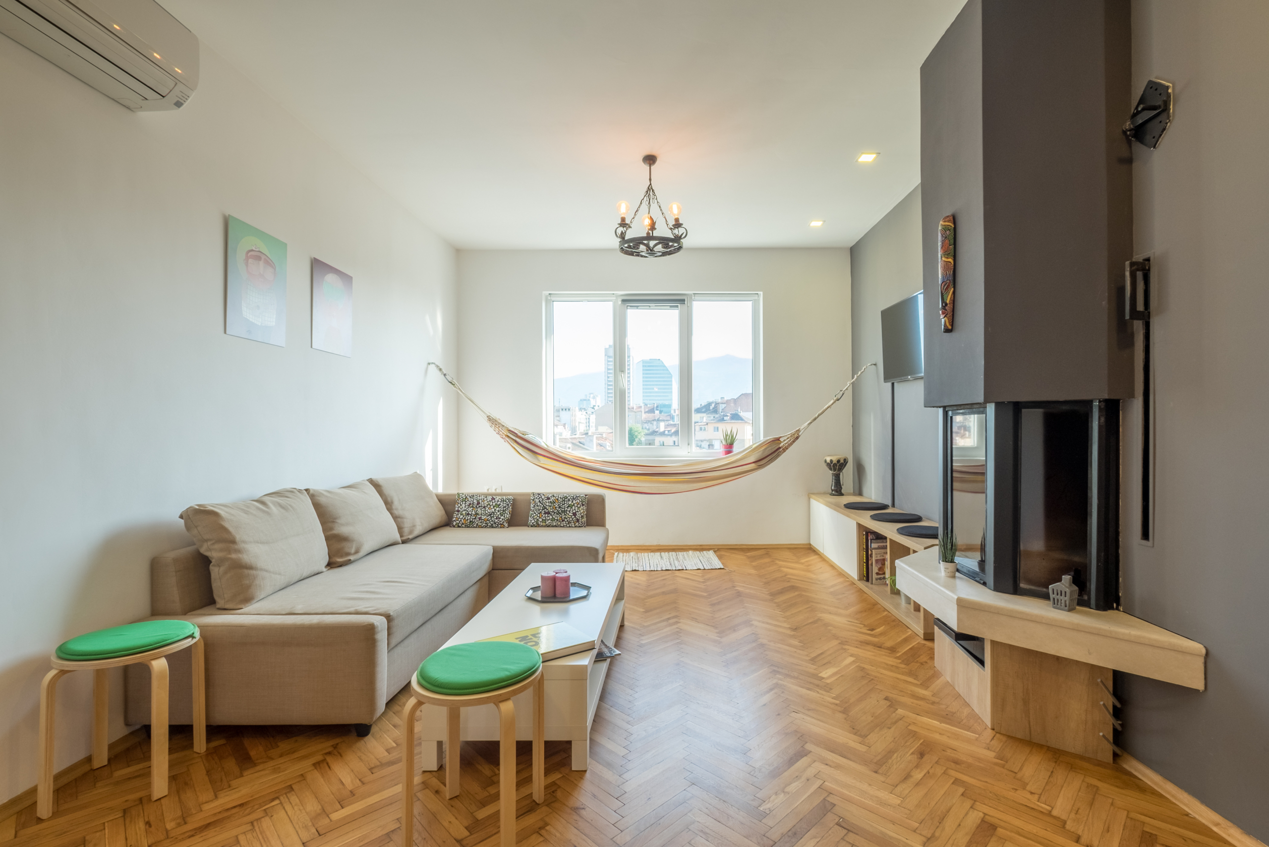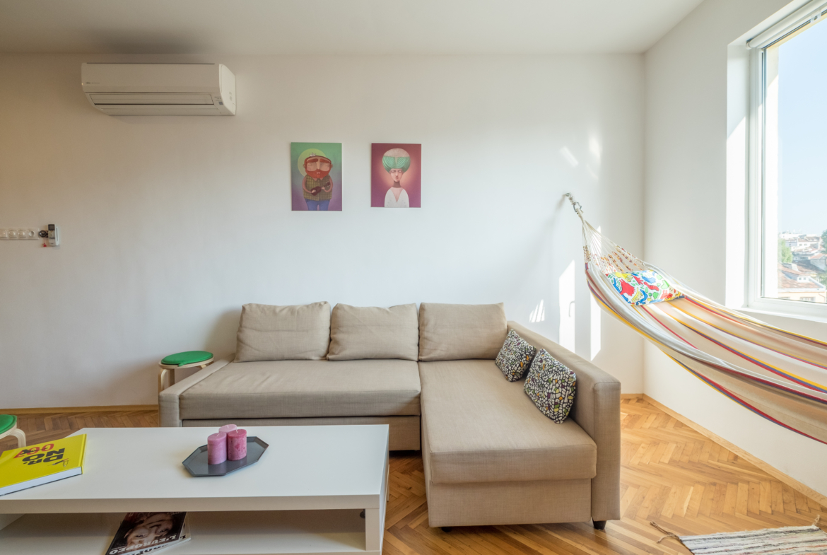 • Spacious and bright living room: The living room is designed with attention to detail, providing coziness and tranquility. Soft furniture creates an ideal place to relax, and the added hammock brings a unique feeling of relaxation and coziness.