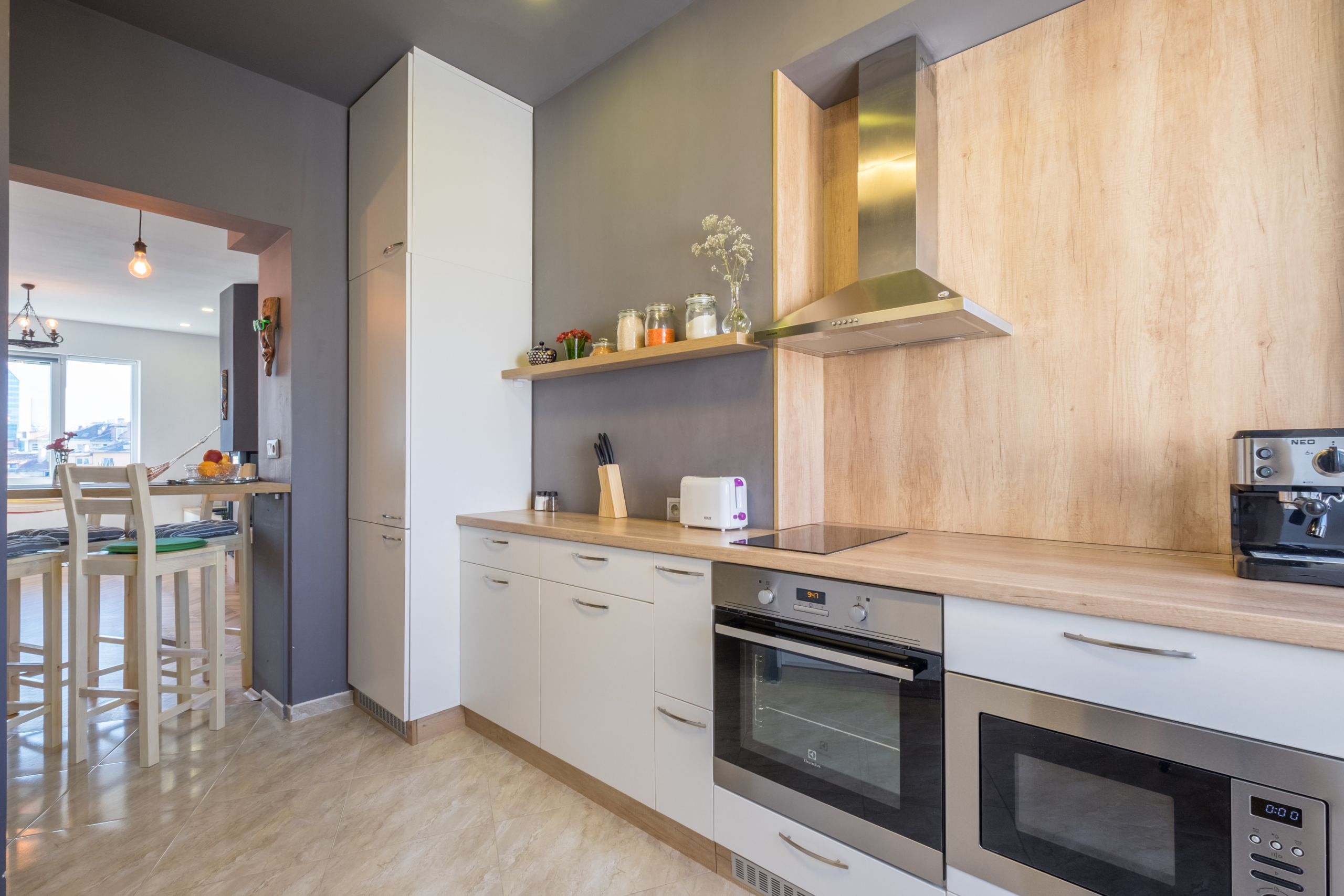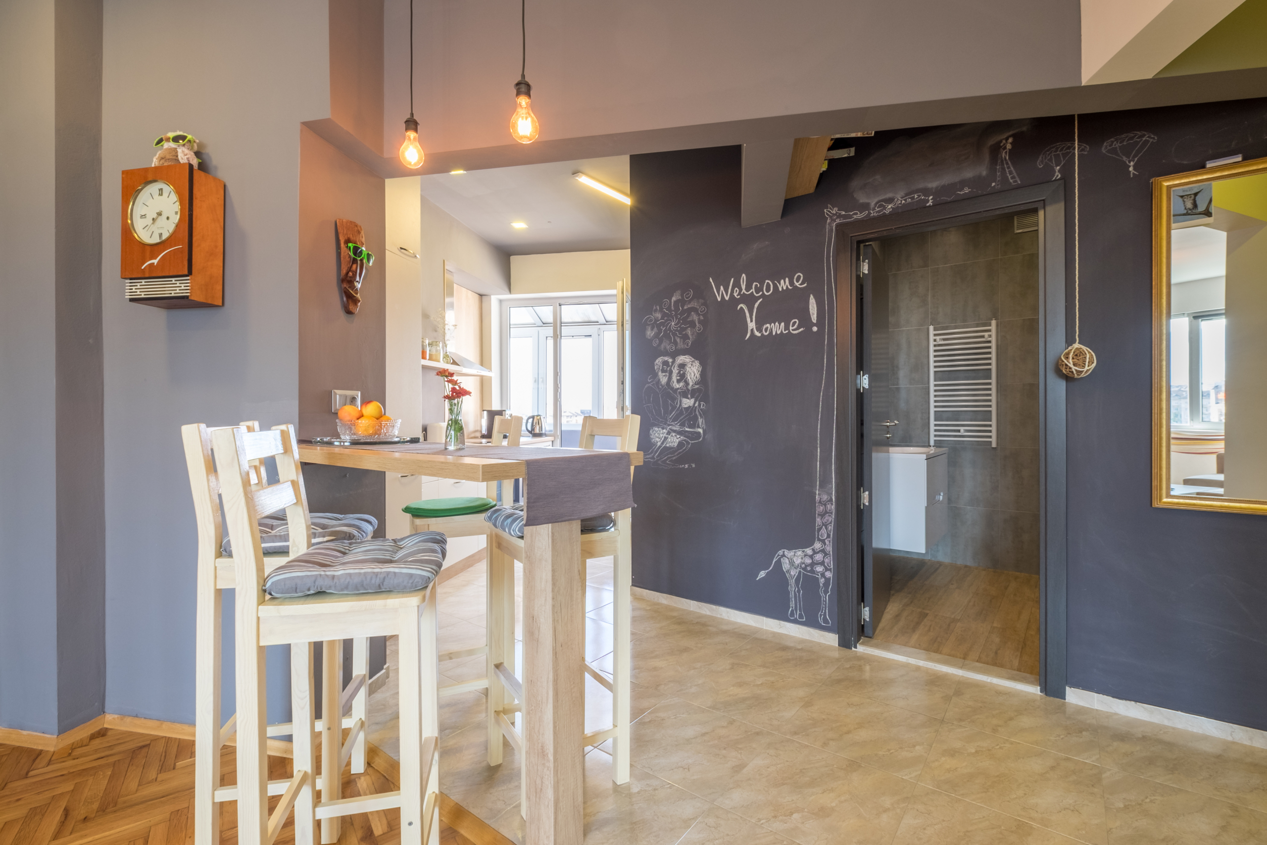 • Dining area: A dedicated dining area with a high table and comfortable high chairs creating a modern and stylish setting.