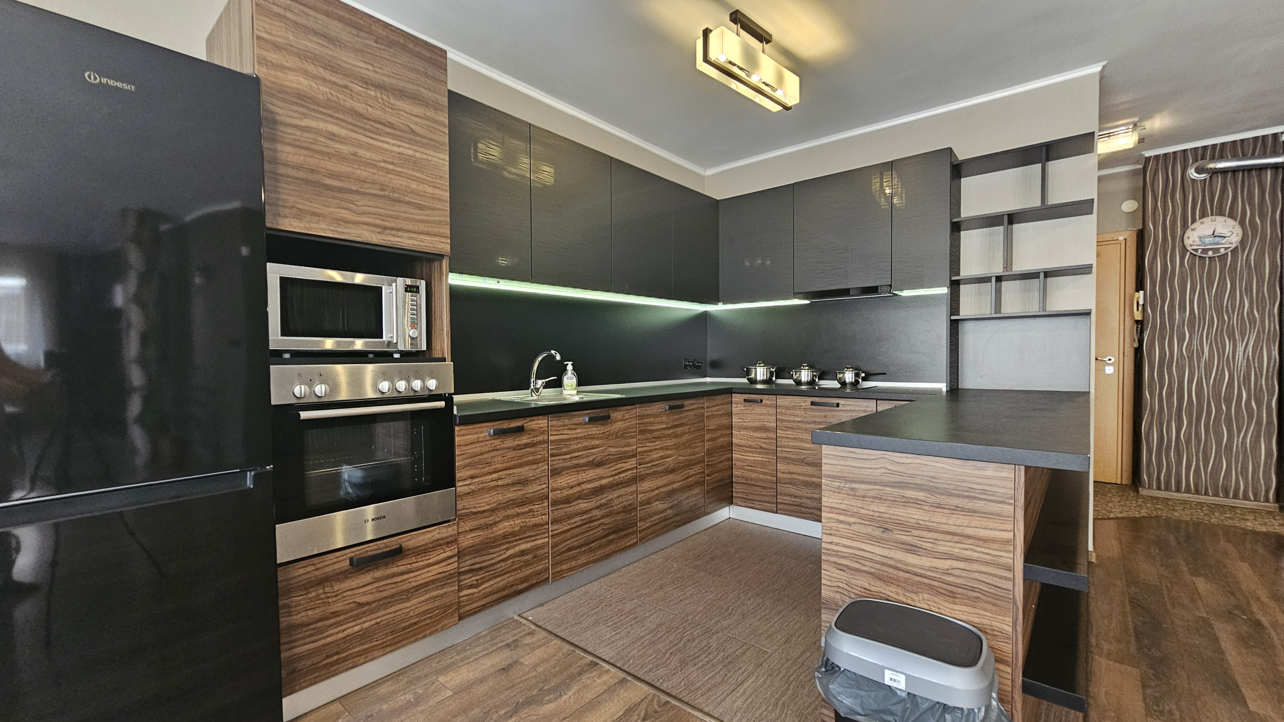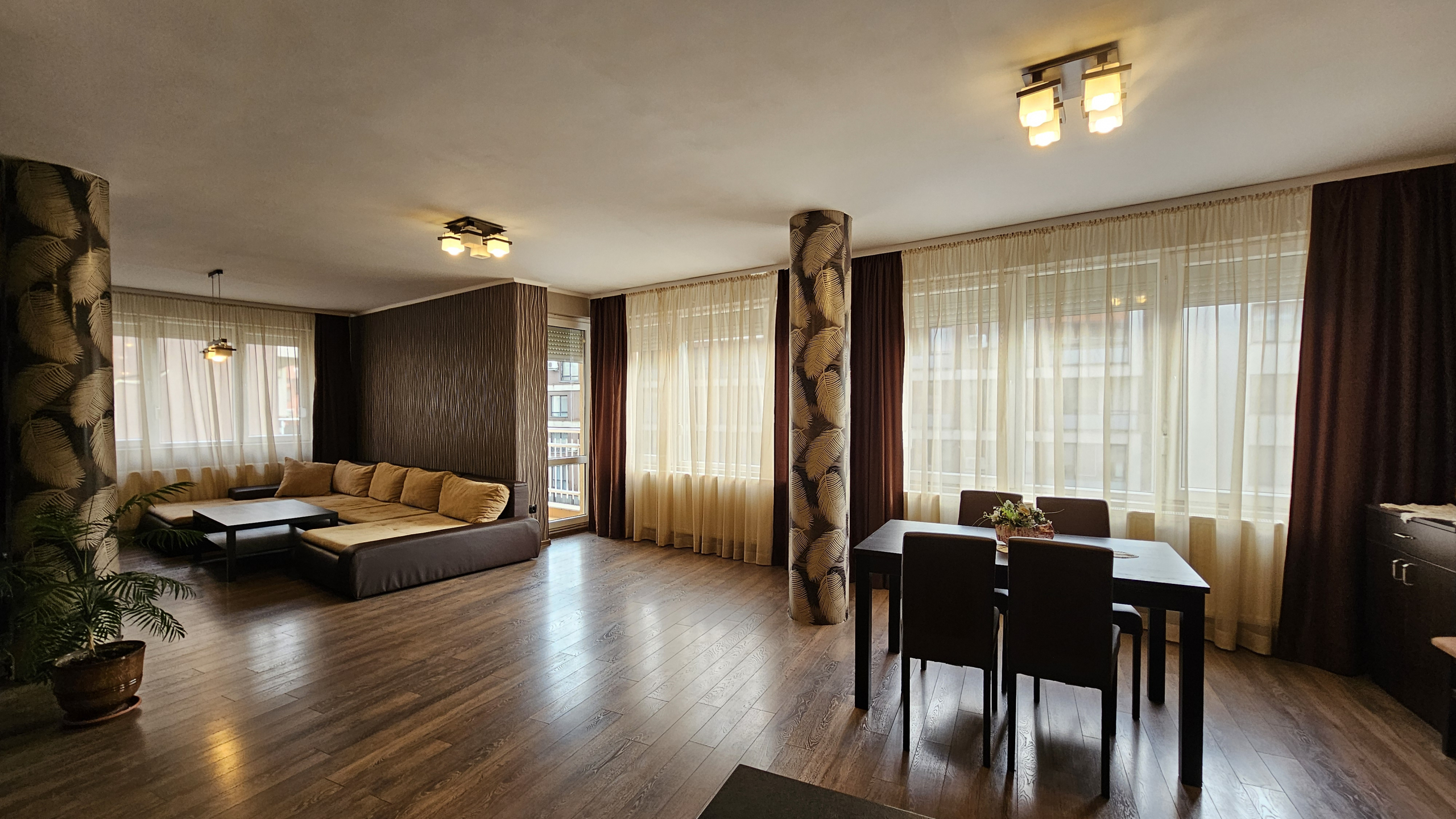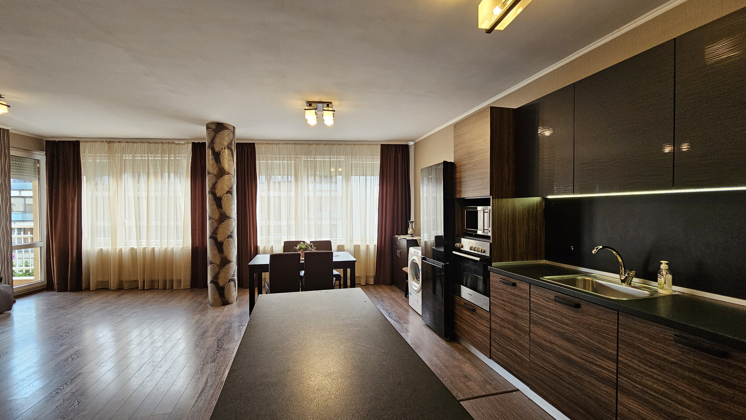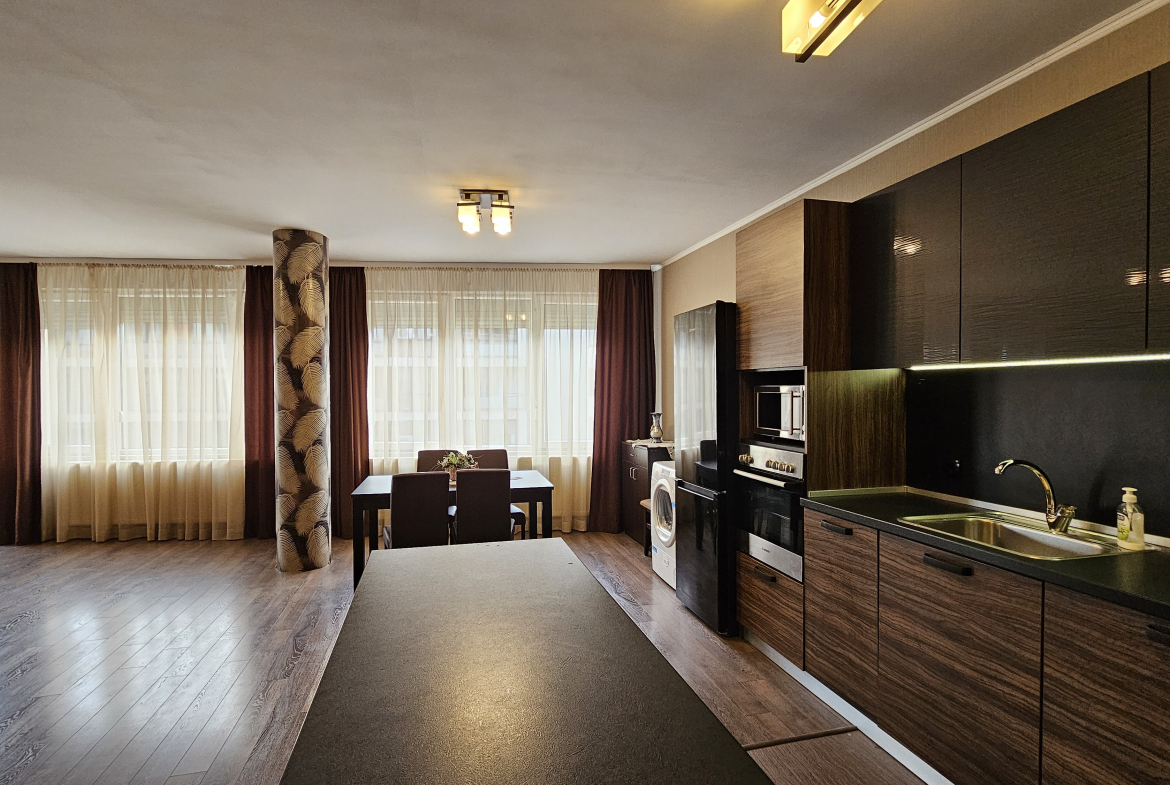 Space and comfort in a fully and modernly furnished three-room apartment in a new building in a convenient location in the residential area. Monastery meadows. The apartment is on the third floor and has an area of 140 square meters, including an entrance hall, a spacious living room with sofas and a TV with a dining area and a kitchenette, two cozy fully equipped bedrooms, a bathroom with a toilet and two terraces with a view of the surroundings. Electric heating with air conditioners. Fully furnished and equipped with new furniture and electrical appliances, ensuring maximum comfort and coziness.