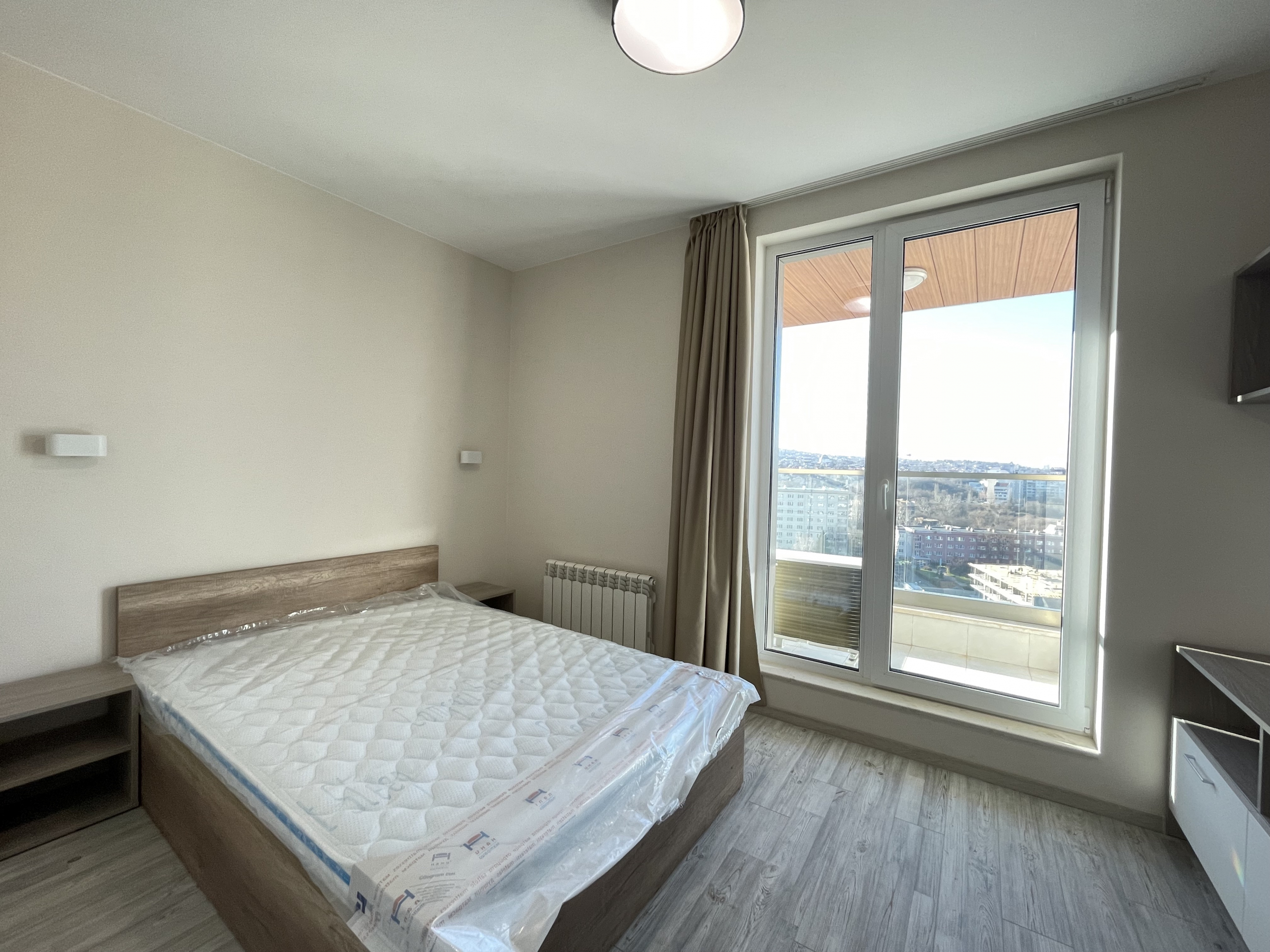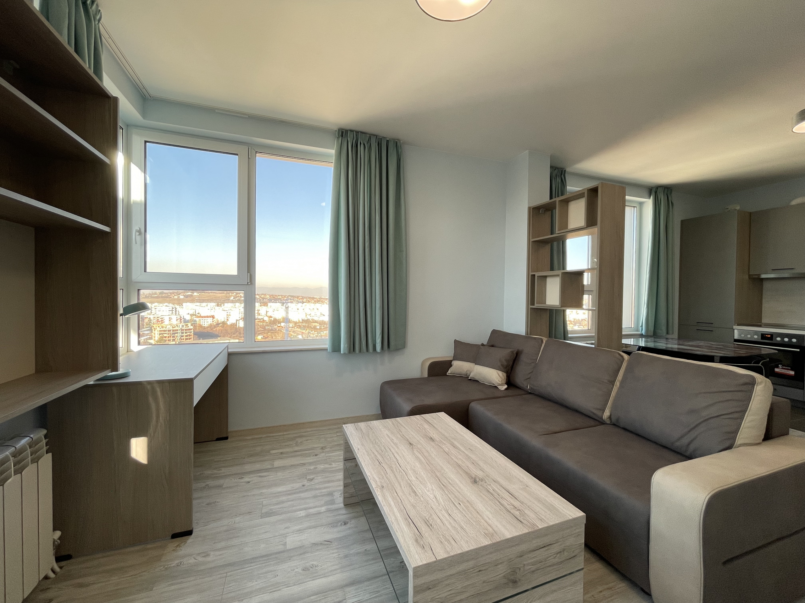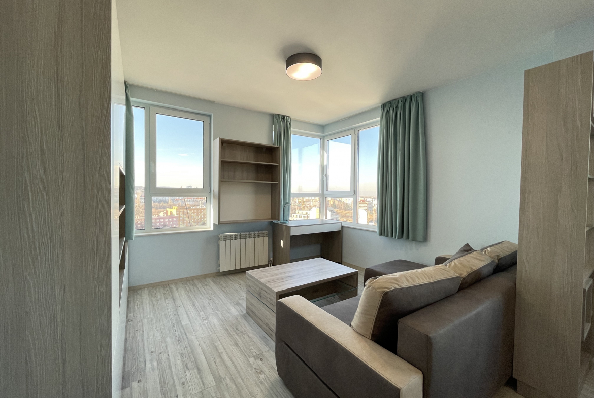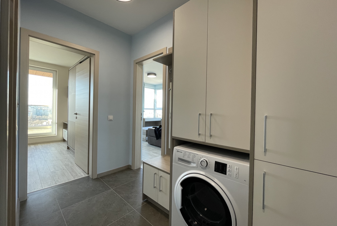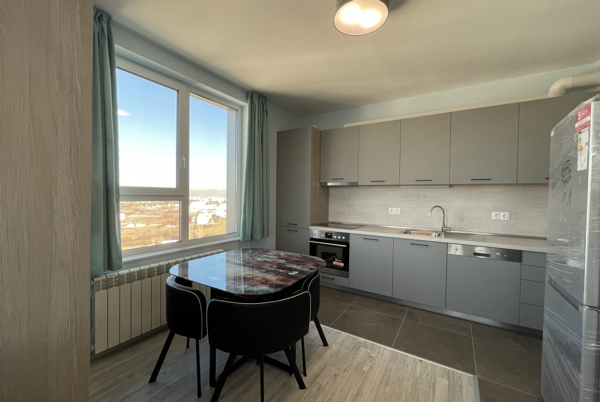 Bright and modern two-room apartment in residential complex. Ovcha Kupel, Montevideo Street, in a new modern building from 2020 with an elevator. The apartment has an area of 75 sq.m. and distribution, including a corridor, a bright living room with a kitchen, a bedroom, a bathroom with a toilet and a terrace with a panoramic view of the city.