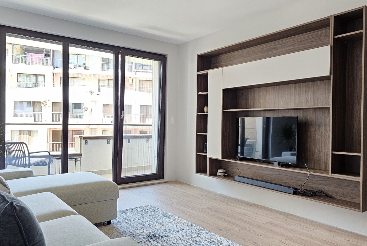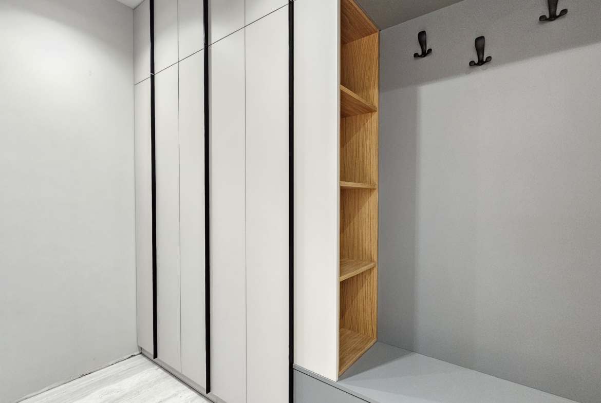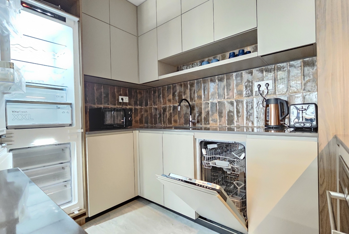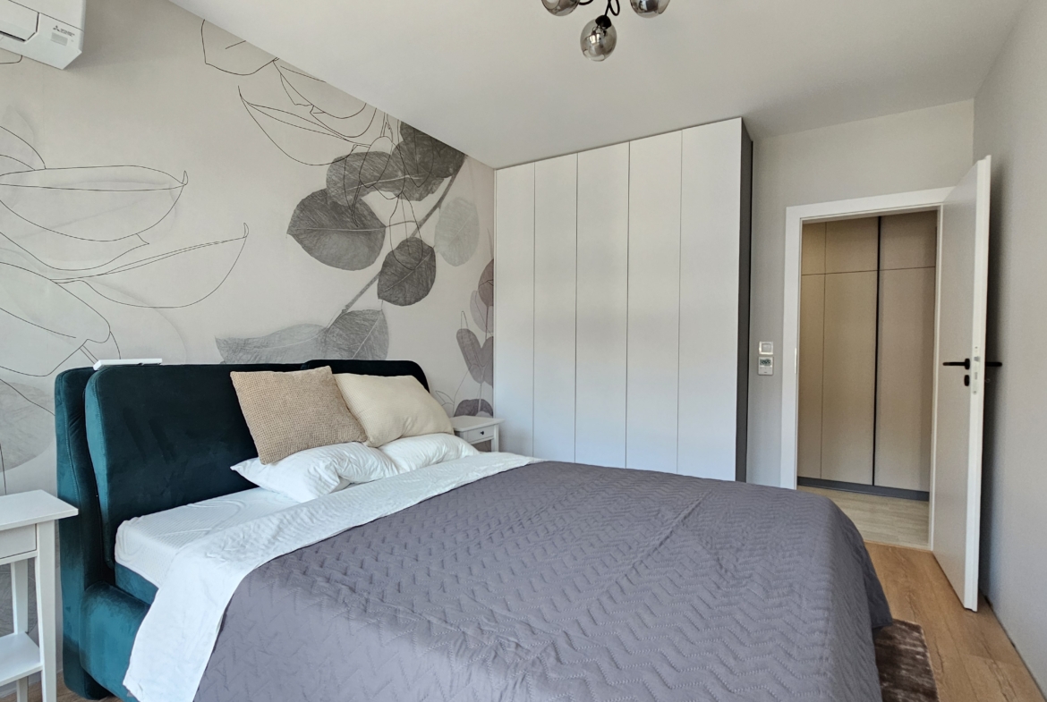 The apartment is finished with high-class custom-made furniture, central heating, air conditioning and the distribution is as follows: