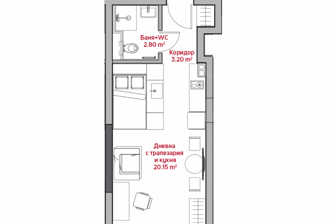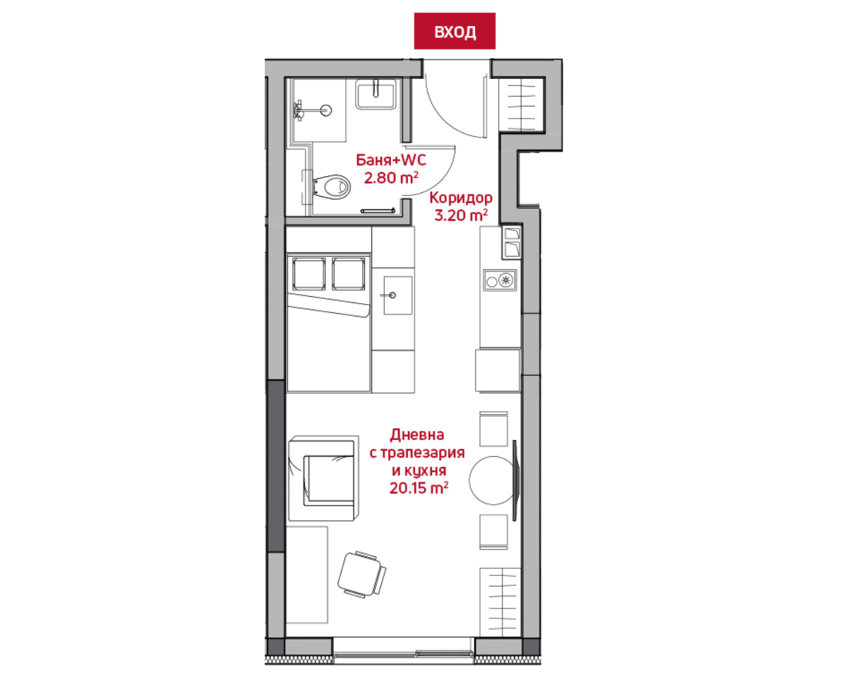 Това е едностаен апартамент проектиран с внимание към детайла и максимално ефективно използване на пространството. Разполага с входно антре (3.20 кв.м), с дневна зона включваща трапезария, кухня и малък спален кът (20.15 кв.м) и баня с тоалетна (2.80 кв.м).