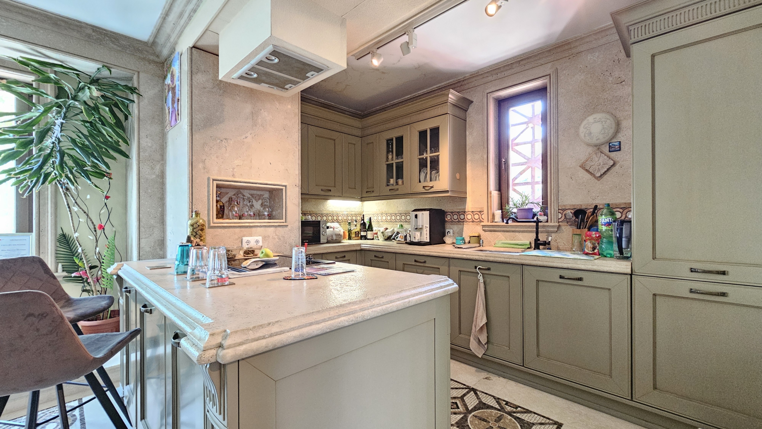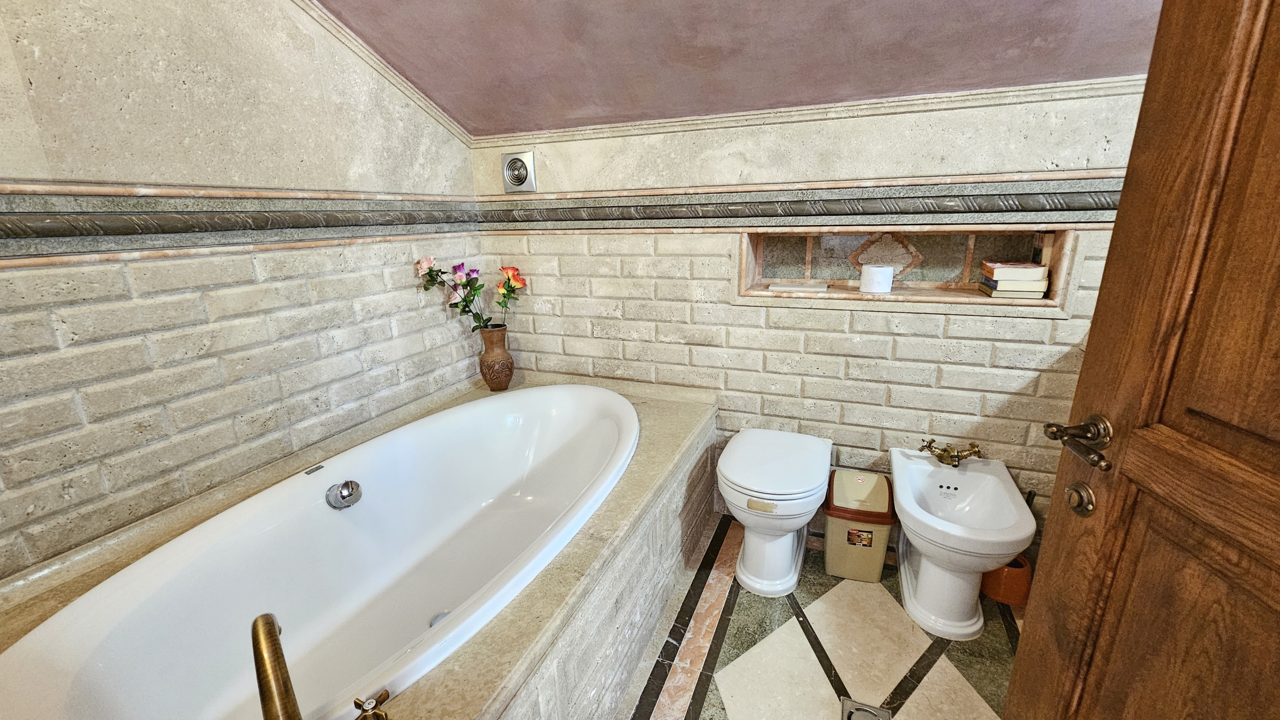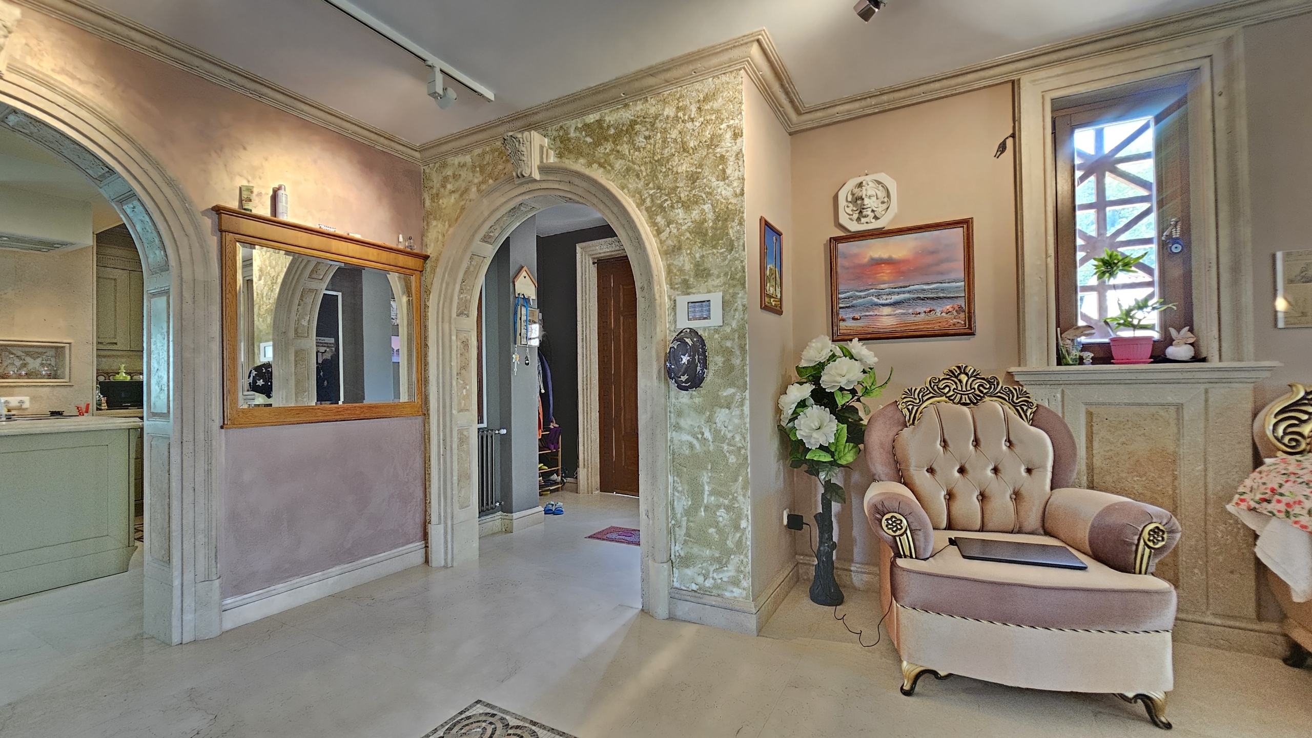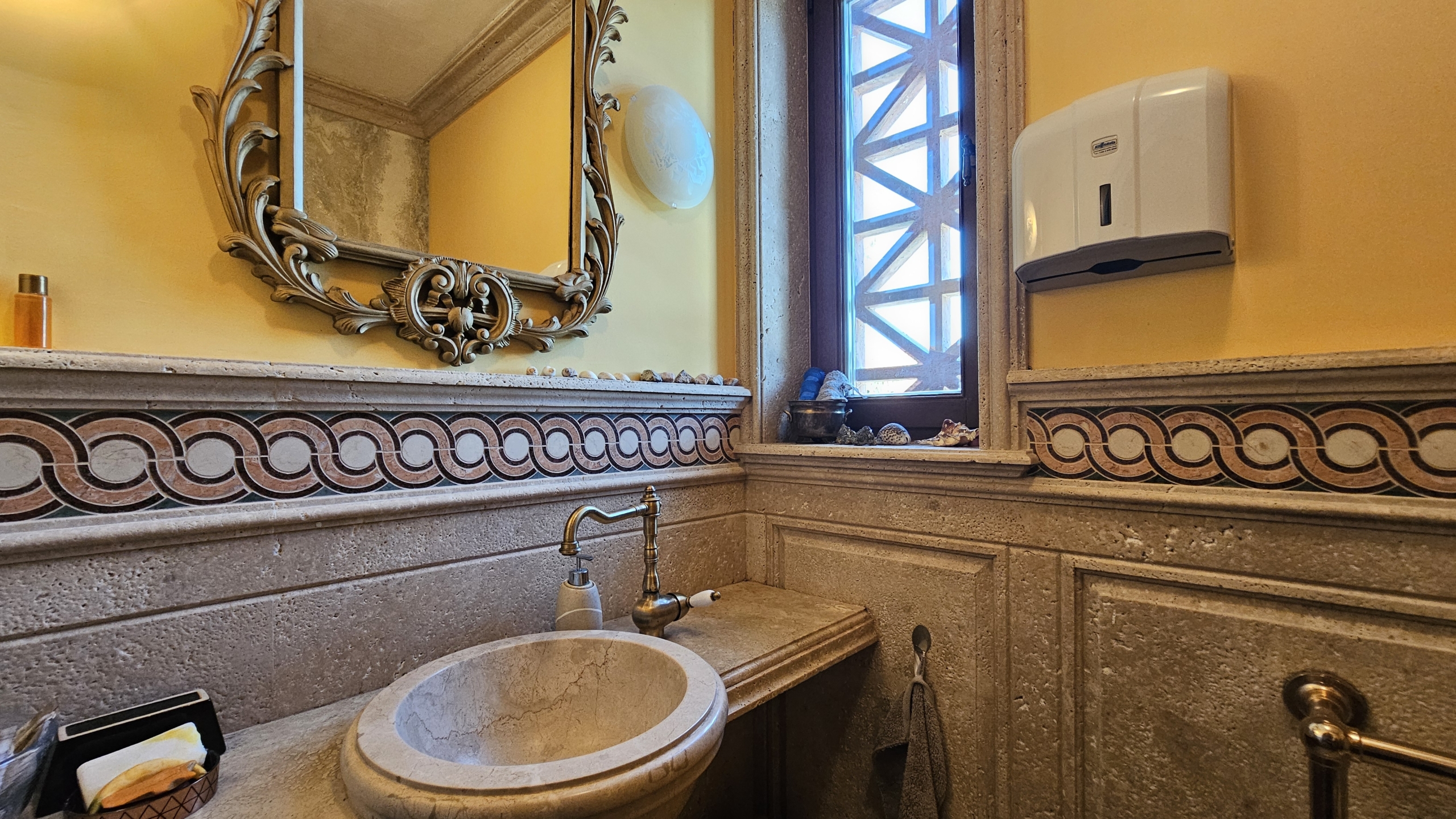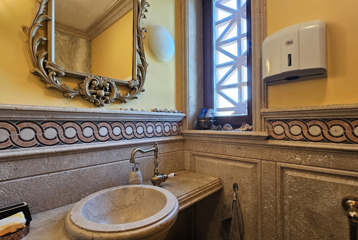 - Луксозни облицовки от травертин и мрамор с вградени естествени полускъпоценни камъни, вдъхновени от древен Рим