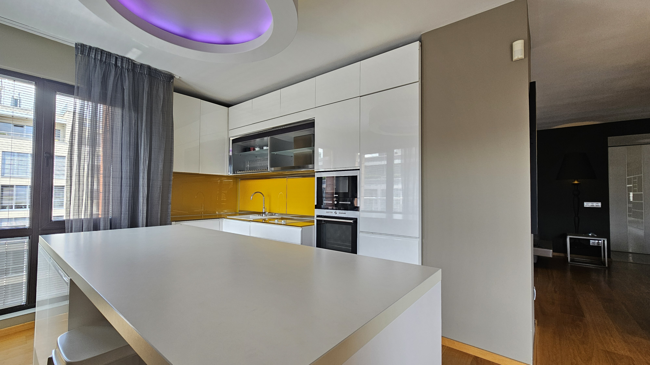• Просторна дневна с трапезария и кухня: Голямо и светло помещение, което съчетава уютен кът за почивка, трапезария и модерно оборудвана кухня.