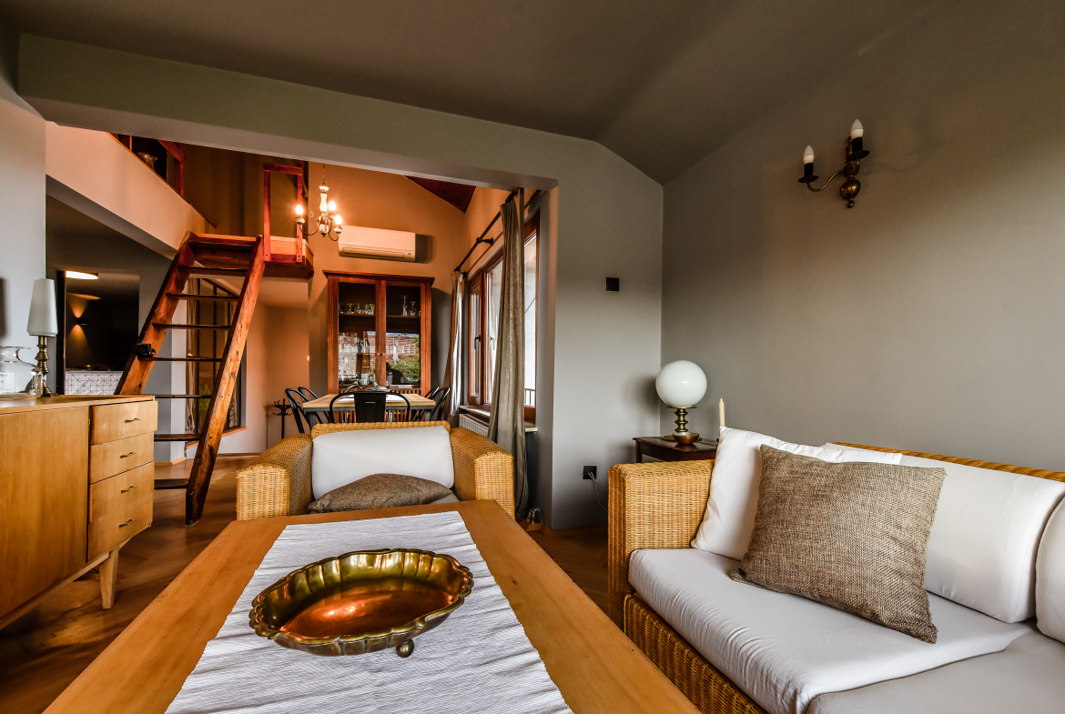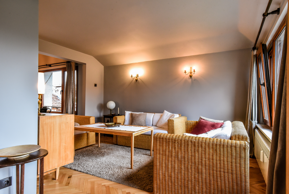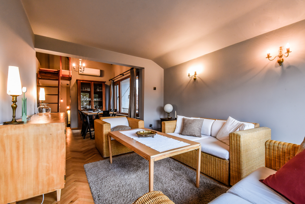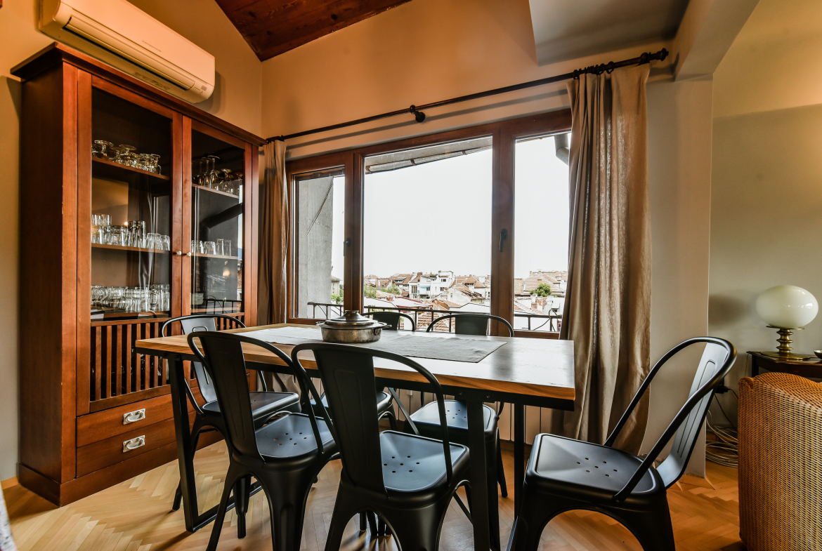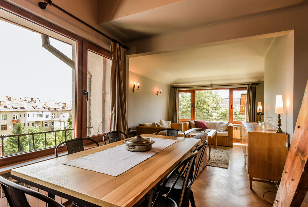 Модерно обзаведен тризонет в идеалния център на София с артистичен интериор! Жилището обединява стил, простор и функционалност на три нива със следното разпределение:
