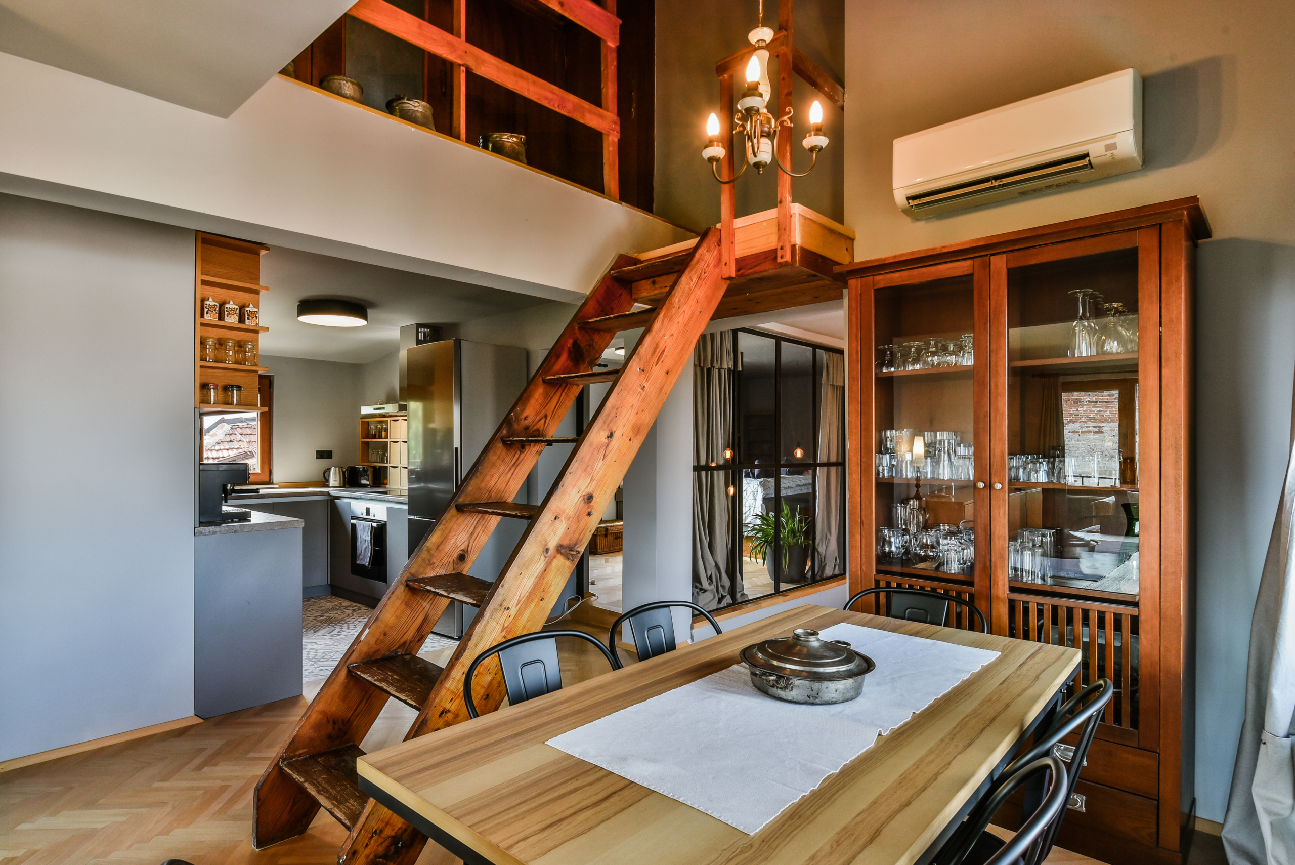 • Главен етаж с всекидневна, разполагаща с уютна област за отдих и трапезария с климатик
