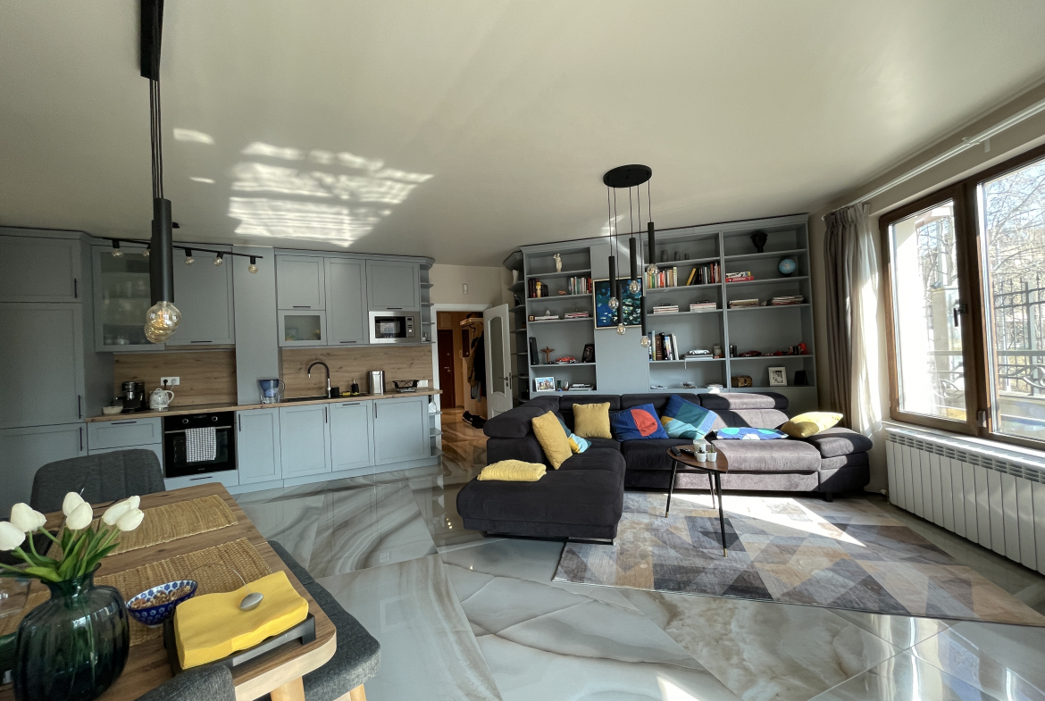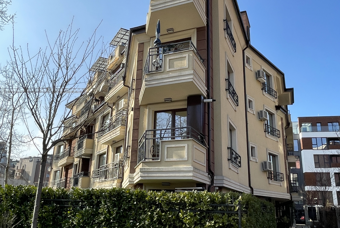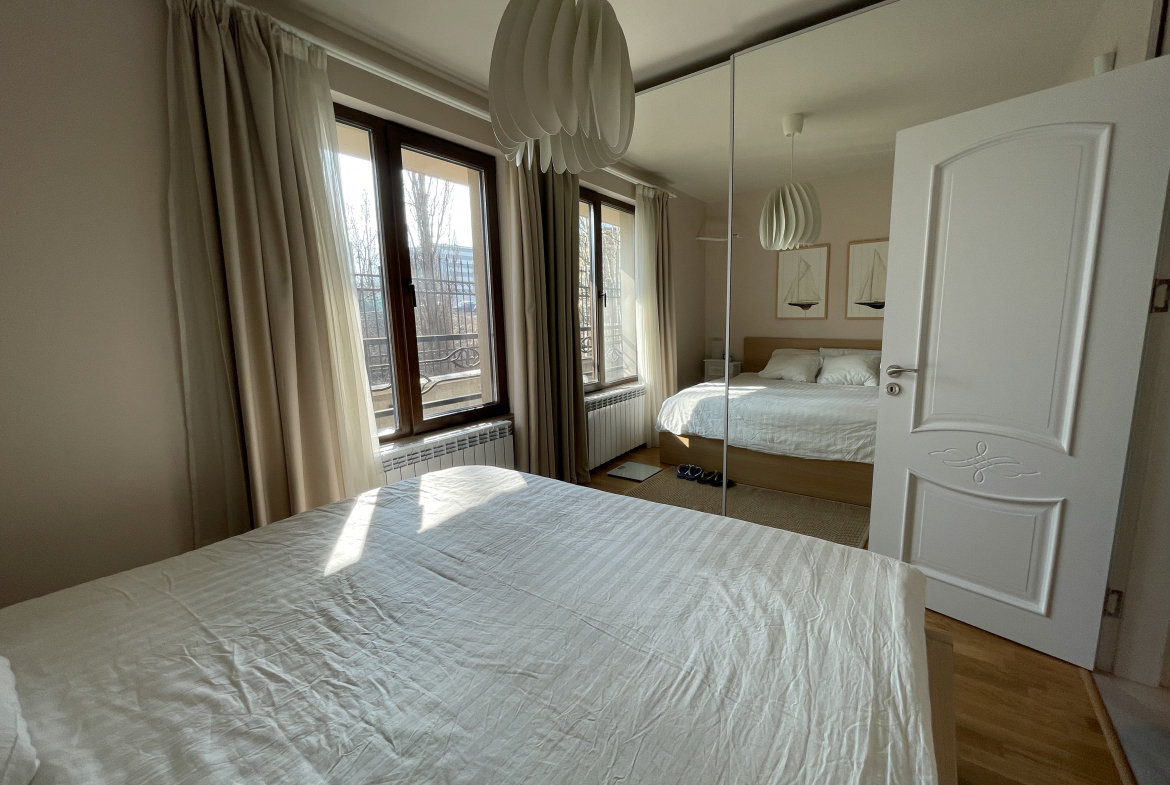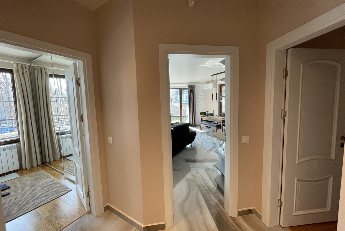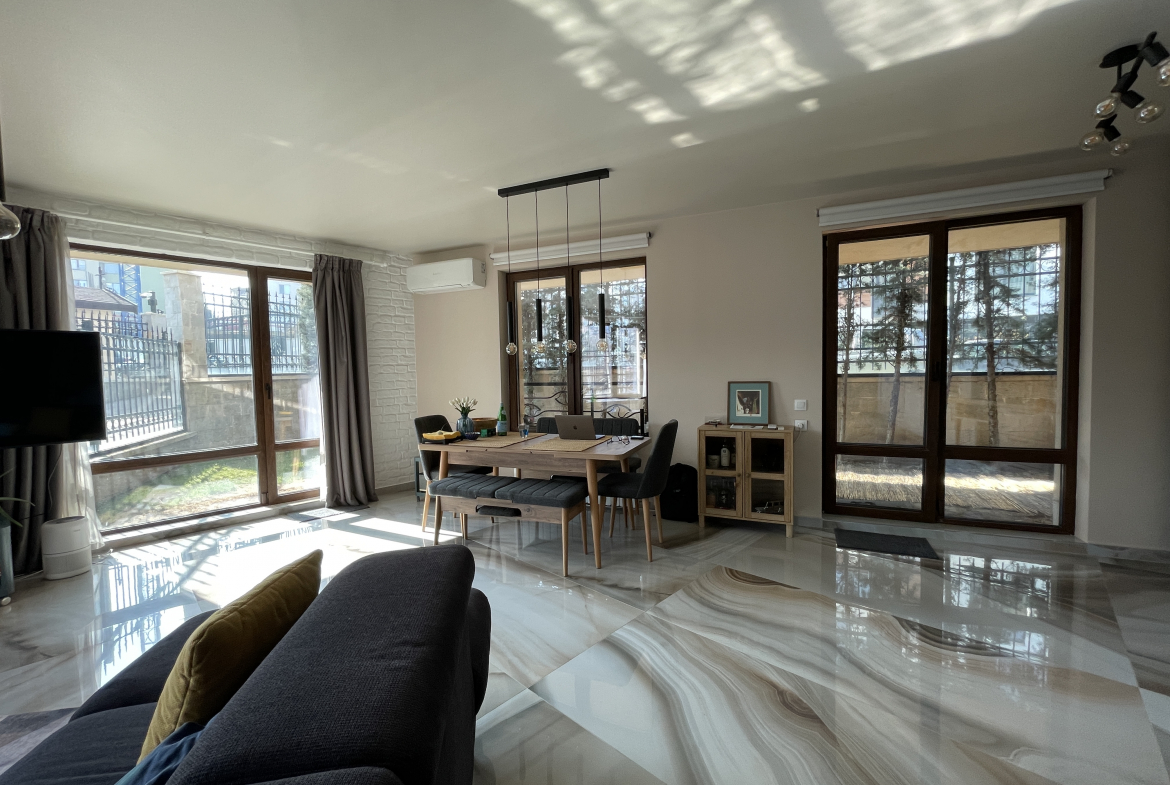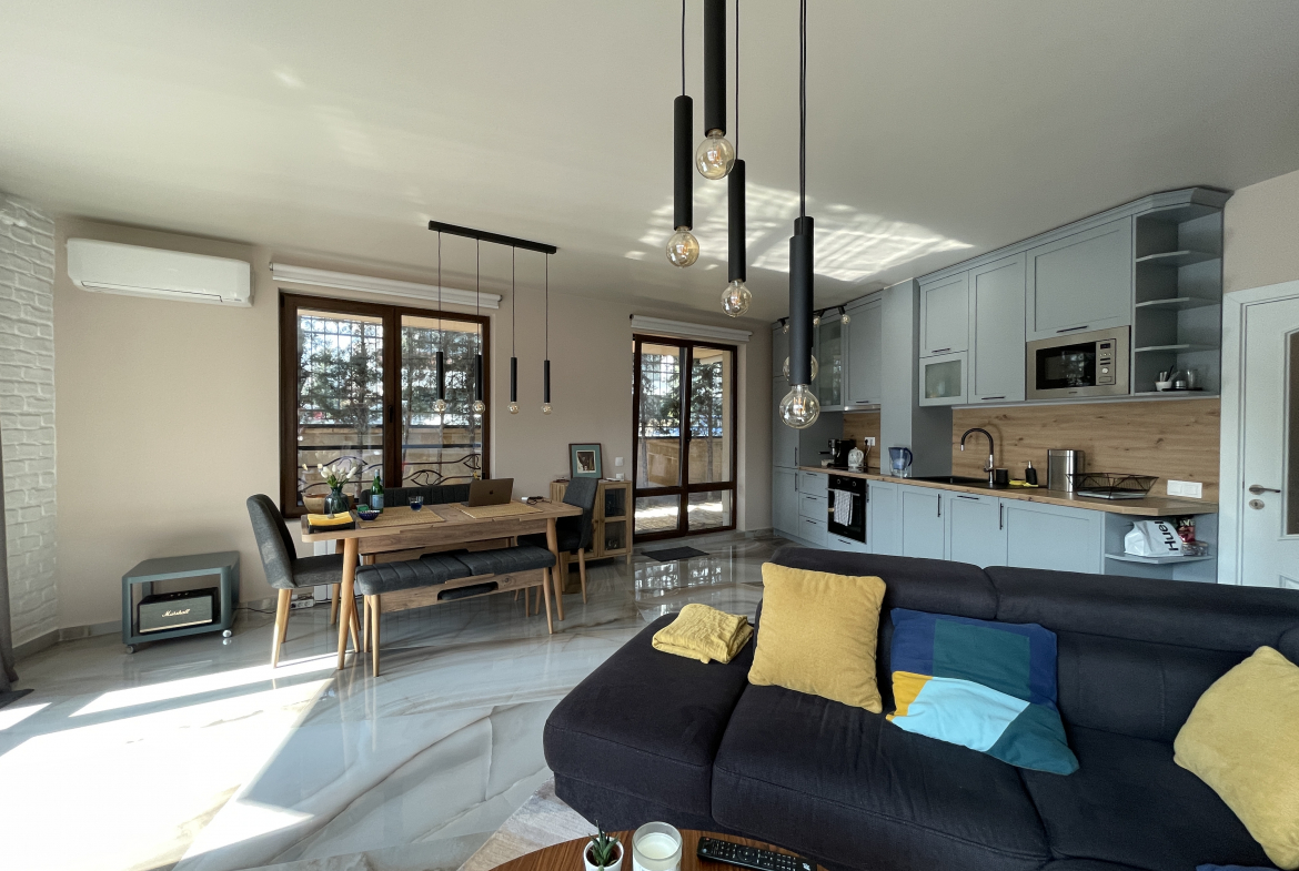 Уютен и модерно обзаведен апартамент в индустриален стил, намиращ се в новa луксозна сграда от 2018 година. Апартаментът е светъл и просторен като разполага с площ 82 кв.м., функционално разпределена на коридор, всекидневна с кухненски бокс, 2 спални и 2 бани с тоалетна. Жилището се намира на партерен етаж от затворен жилищен комплекс, което осигурява директен достъп до прилежащ уютен двор. Възможност за наемане и на подземно паркомясто - 100 евро!