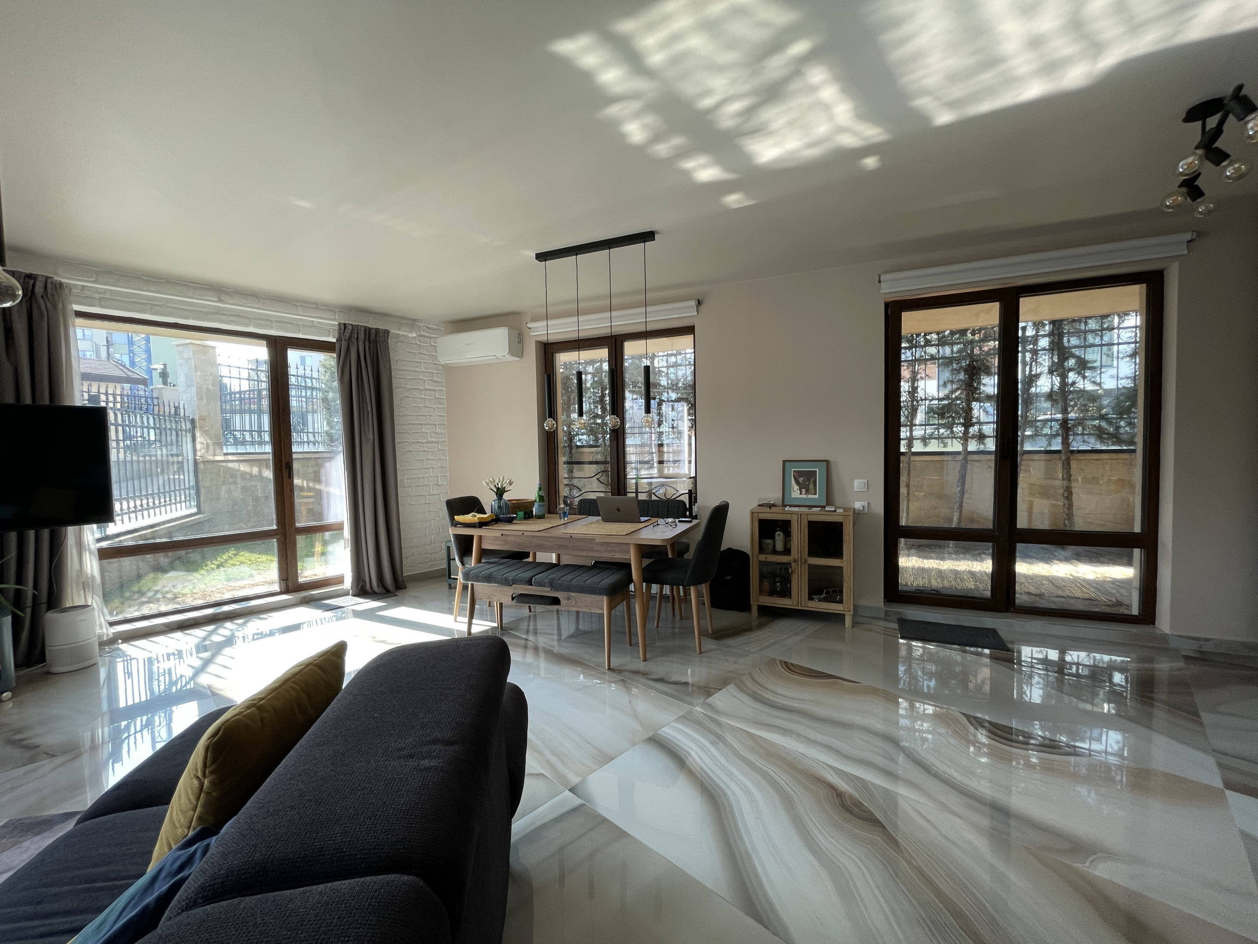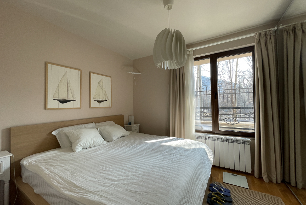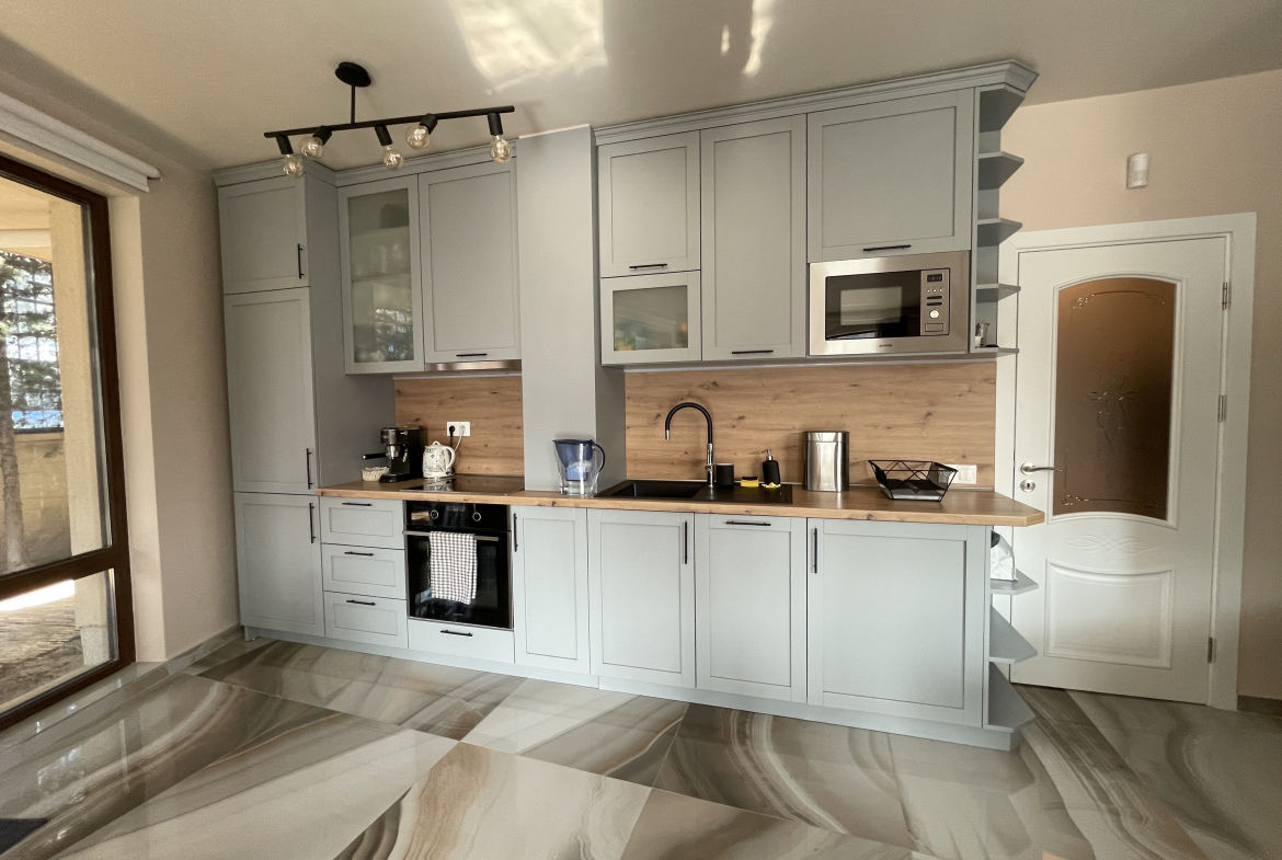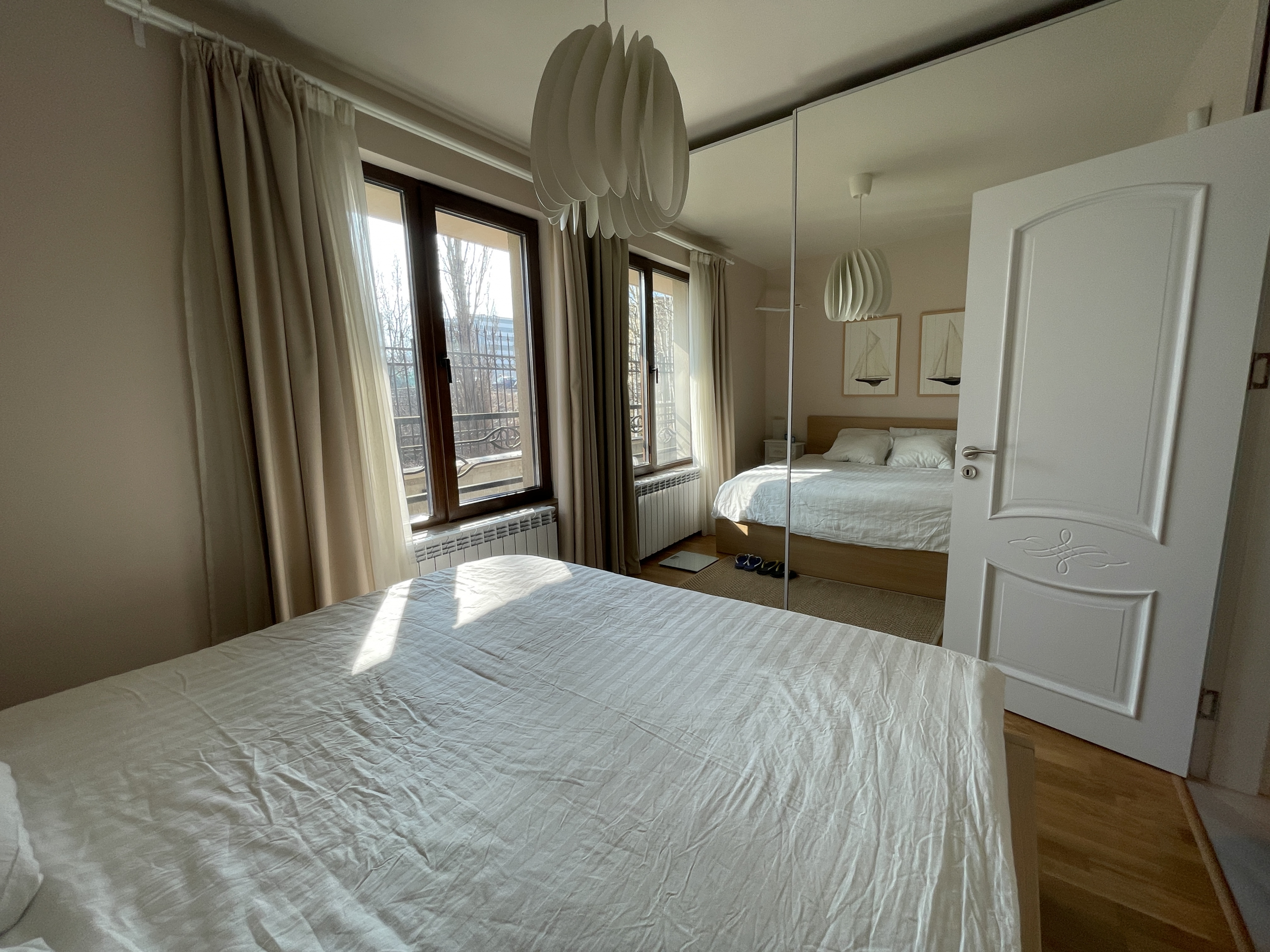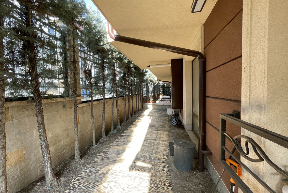 Уютен и модерно обзаведен апартамент в индустриален стил, намиращ се в новa луксозна сграда от 2018 година. Апартаментът е светъл и просторен като разполага с площ 82 кв.м., функционално разпределена на коридор, всекидневна с кухненски бокс, 2 спални и 2 бани с тоалетна. Жилището се намира на партерен етаж от затворен жилищен комплекс, което осигурява директен достъп до прилежащ уютен двор. Възможност за наемане и на подземно паркомясто - 100 евро!
