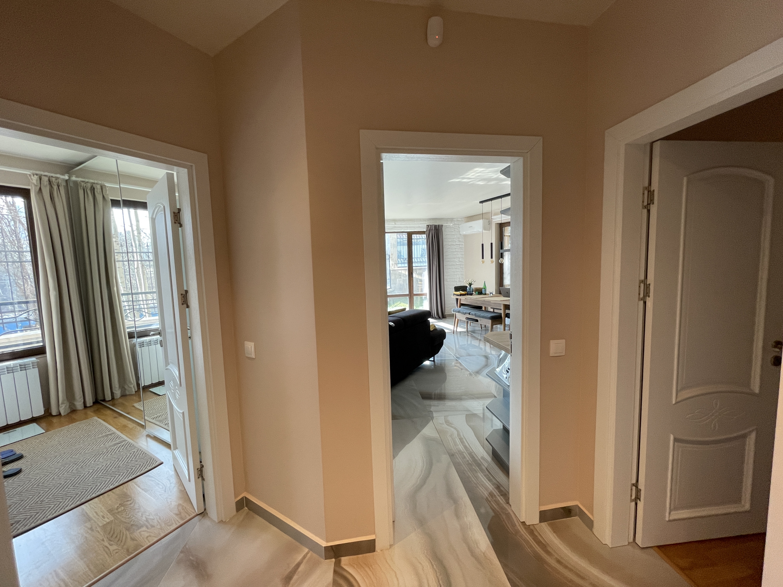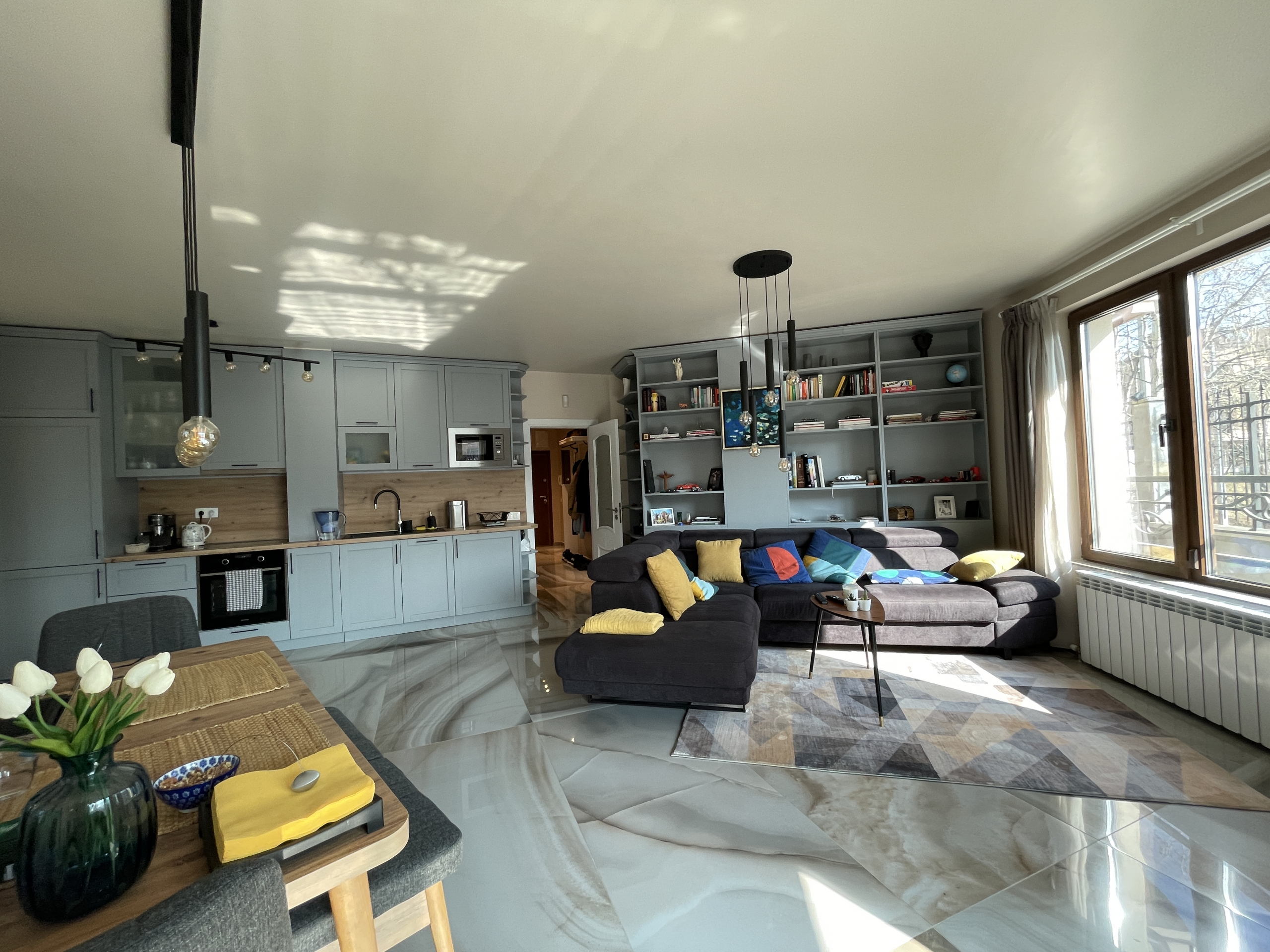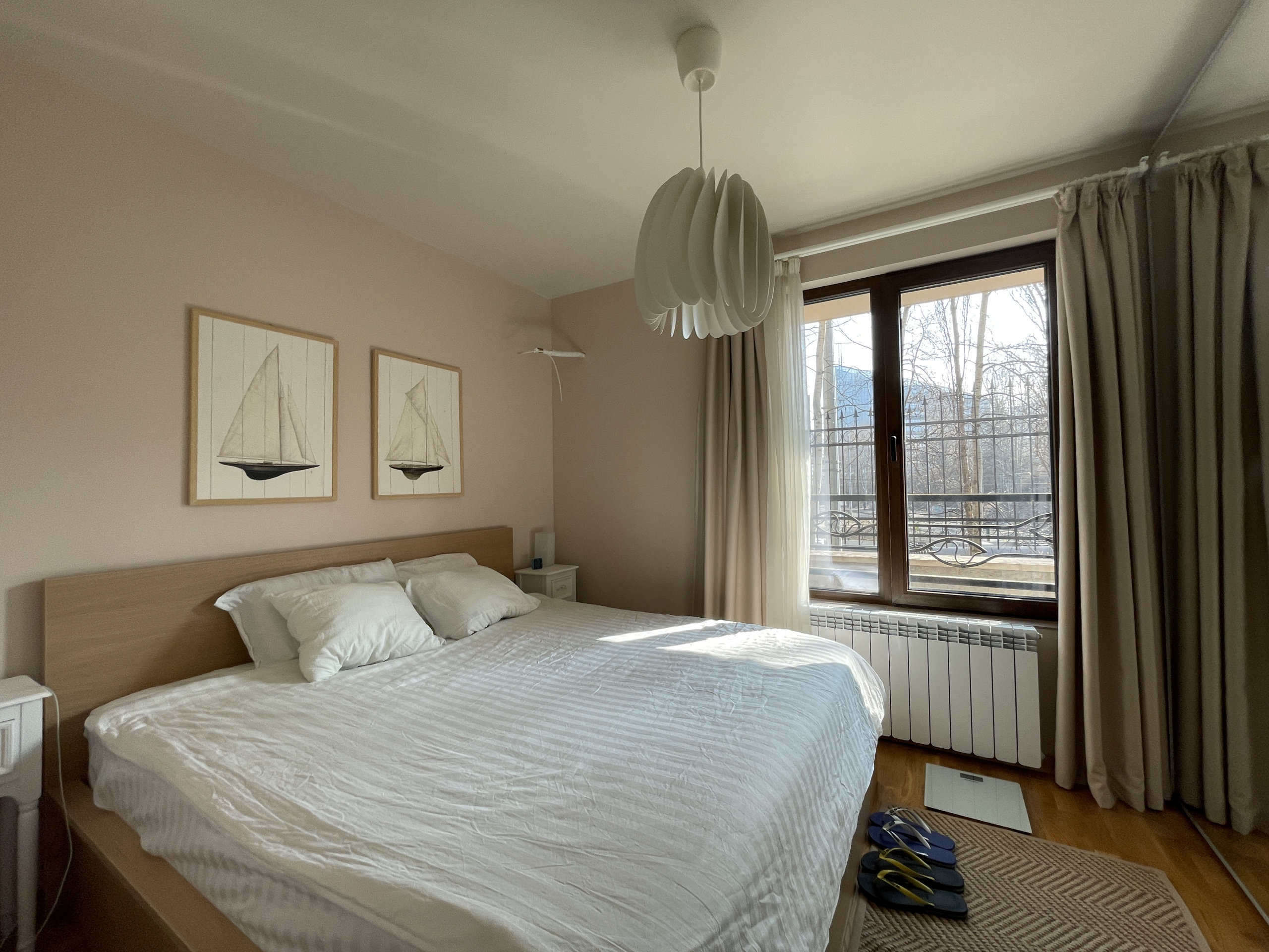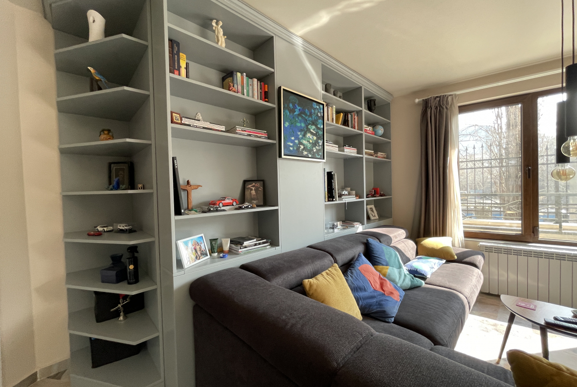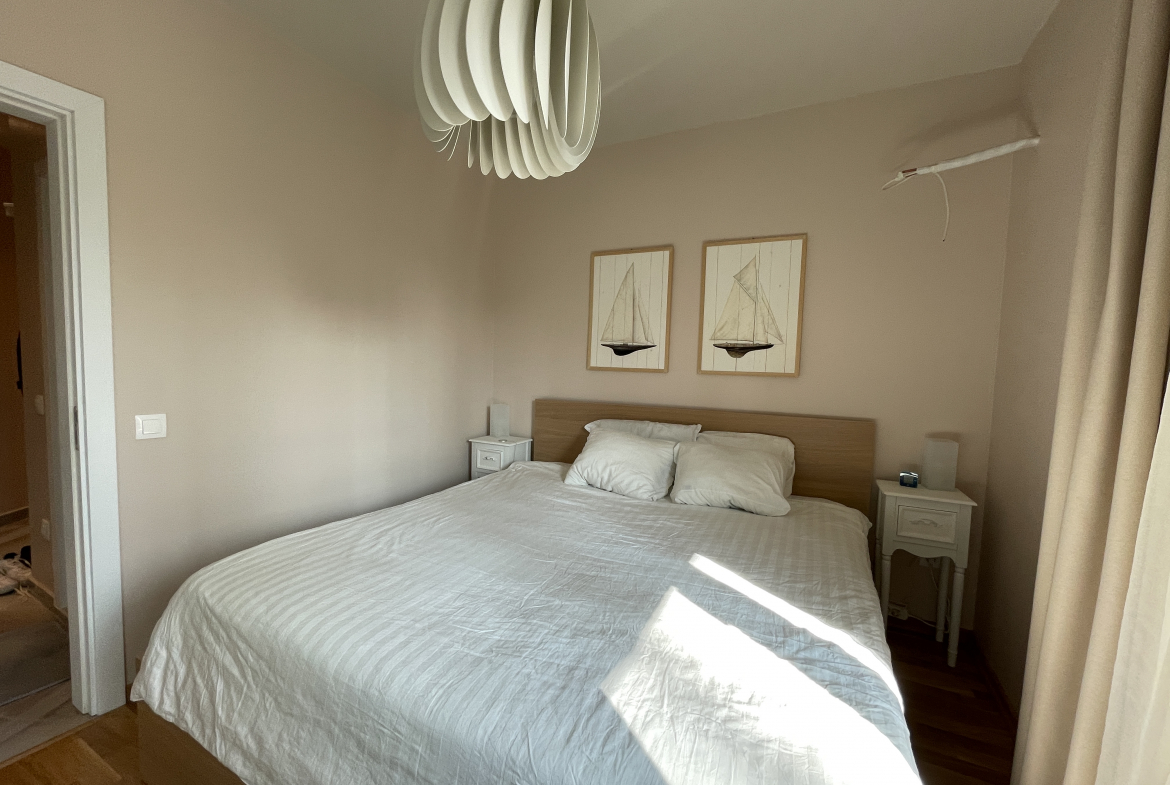 Уютен и модерно обзаведен апартамент в индустриален стил, намиращ се в новa луксозна сграда от 2018 година. Апартаментът е светъл и просторен като разполага с площ 82 кв.м., функционално разпределена на коридор, всекидневна с кухненски бокс, 2 спални и 2 бани с тоалетна. Жилището се намира на партерен етаж от затворен жилищен комплекс, което осигурява директен достъп до прилежащ уютен двор. Възможност за наемане и на подземно паркомясто - 100 евро!