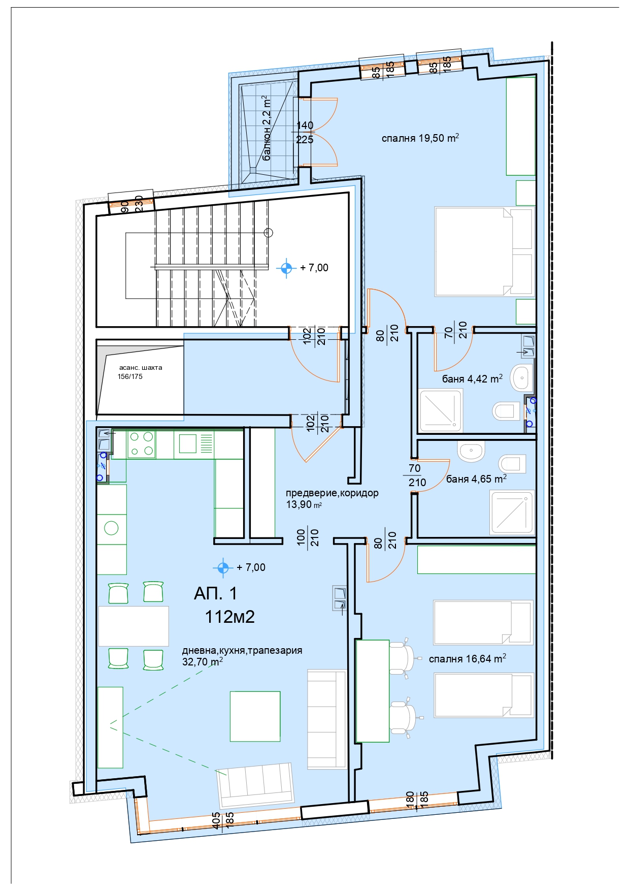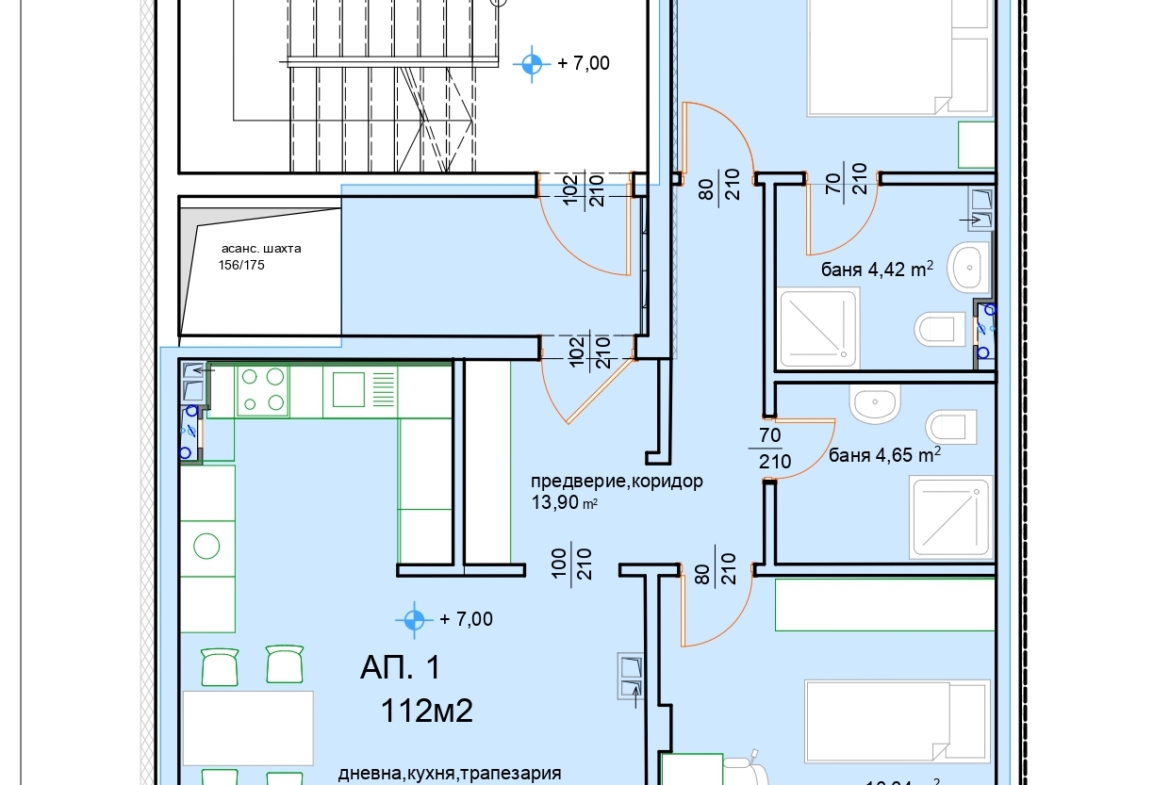 - Разпределение: Две спални, просторна дневна с кухненски тракт (около 33 кв.м), два санитарни възела