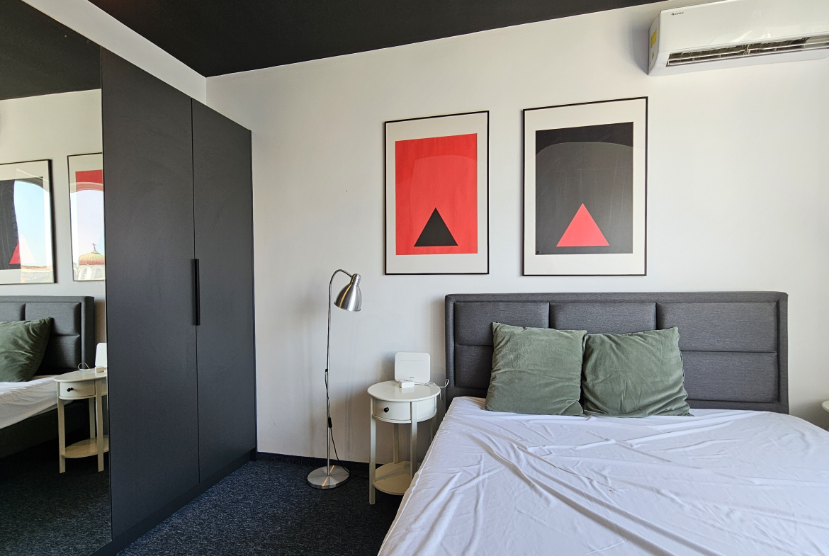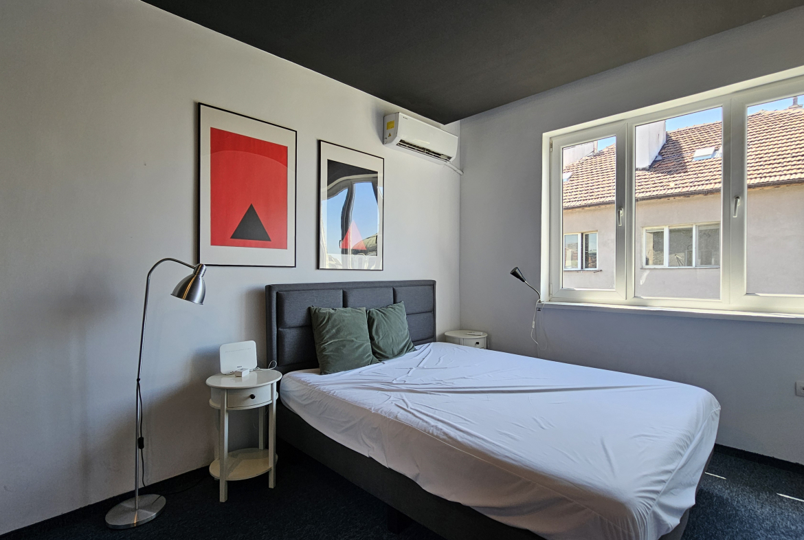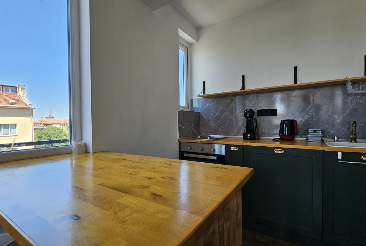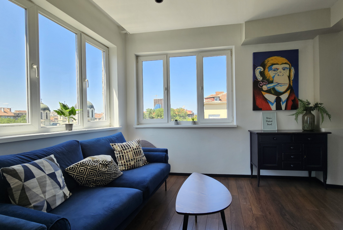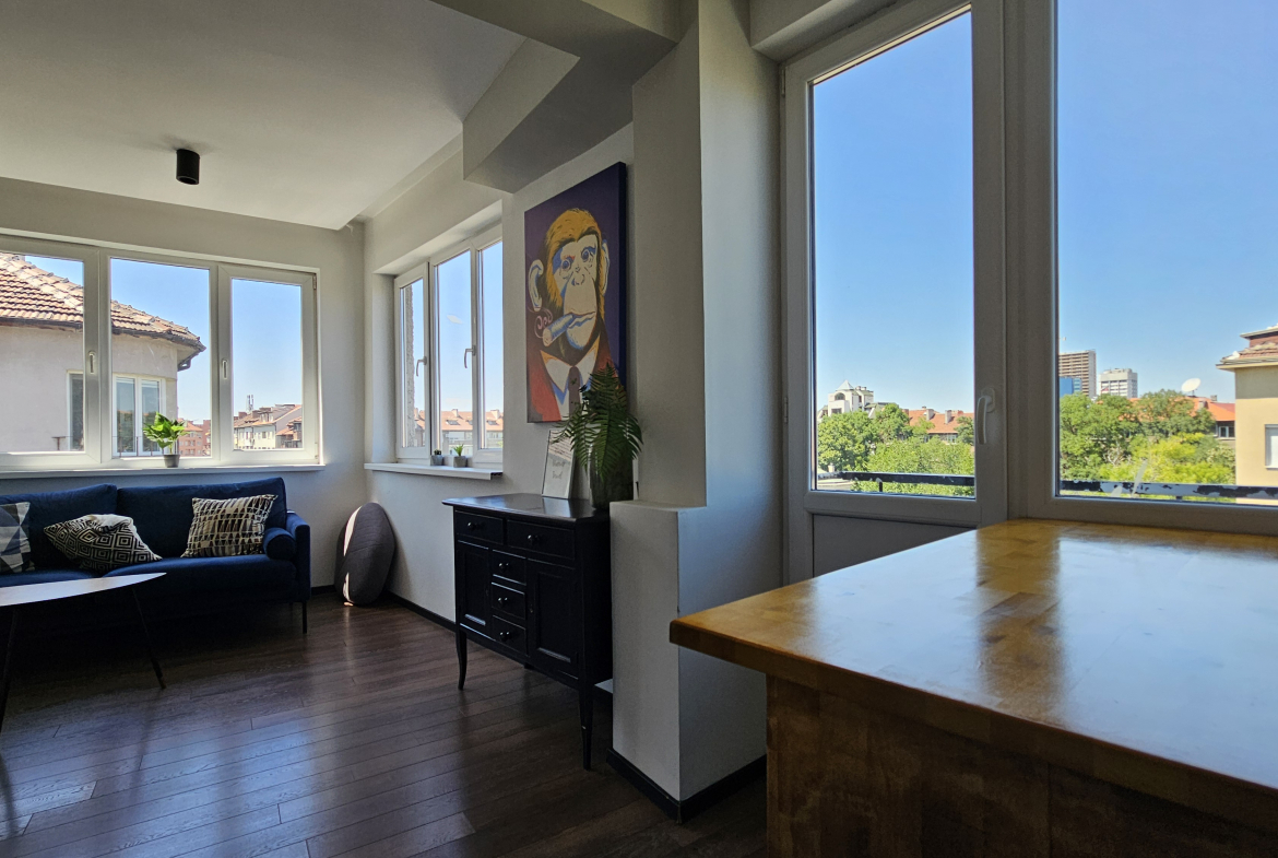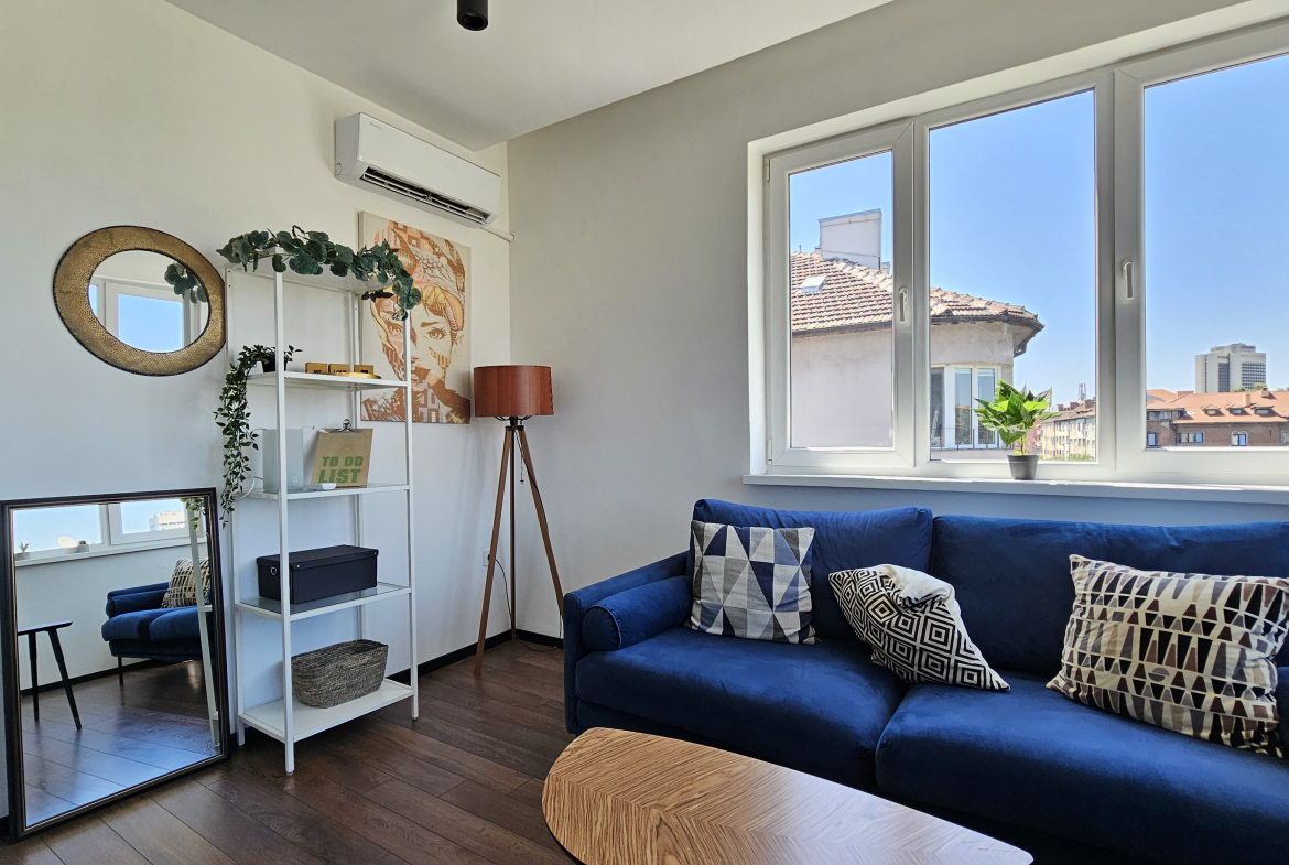 Модерно обзаведен тристаен апартамент, разположен на удобно и комуникативно място в сърцето на града до НДК и пешеходната част на бул. Витоша. С площ от 71 кв.м. апартаменът е функционално разделен на: отворена и светла дневна зона с интегрирана оборудвана кухня, две просторни спални включващи гардероб и климатик, съвременна и стилна баня, оборудвана с всички необходими удобства и тераса- перфектното място за отдих с хубава гледка.