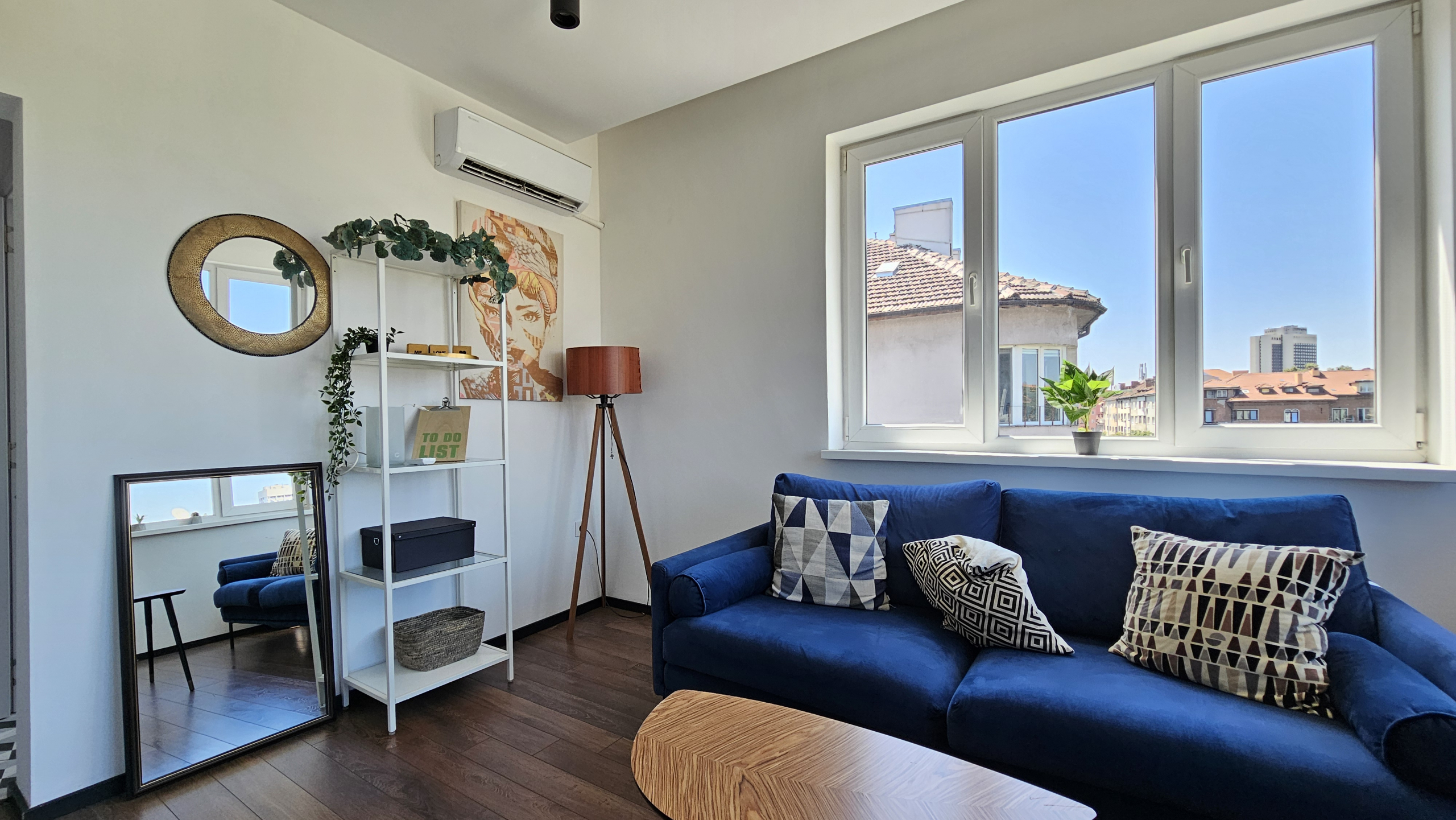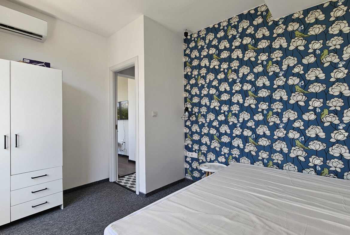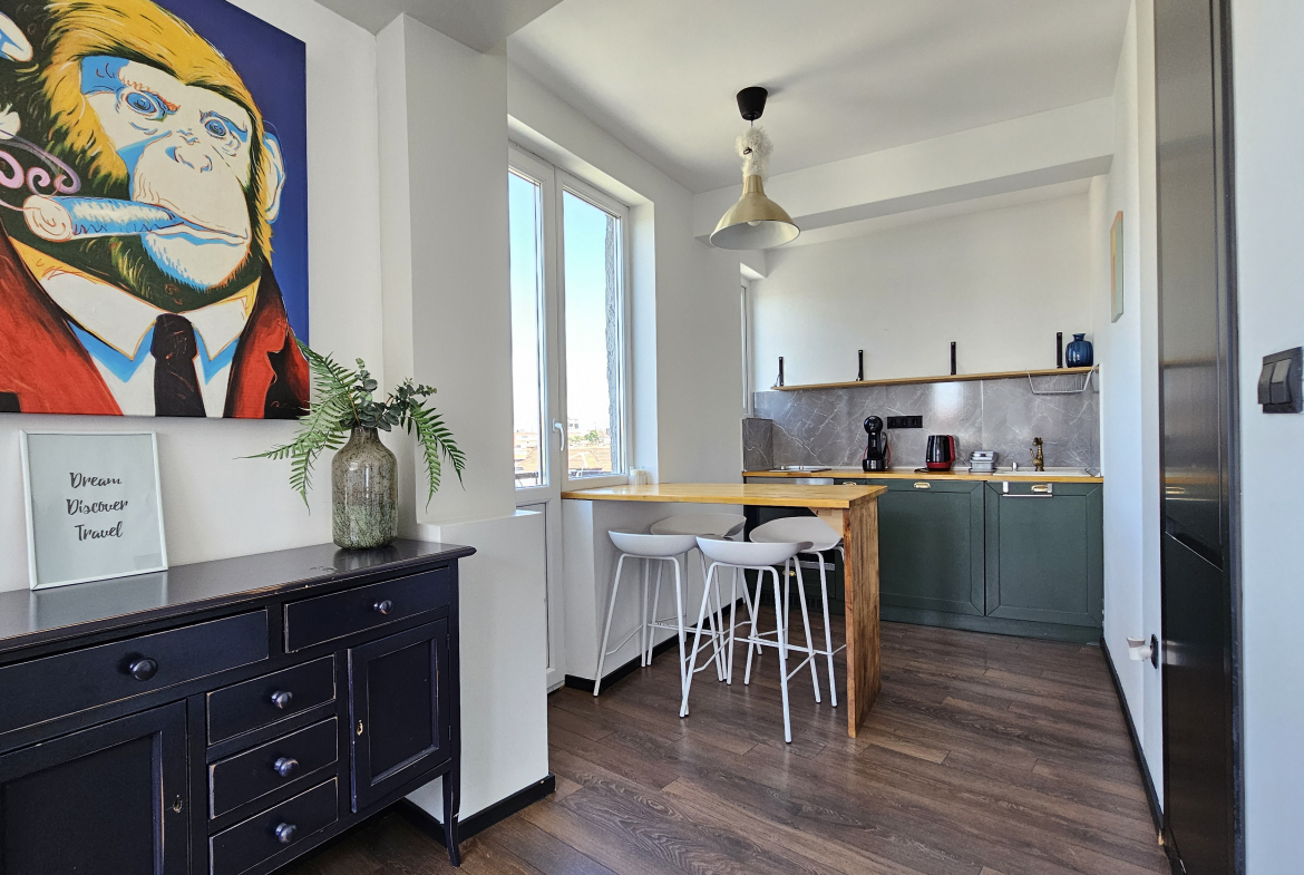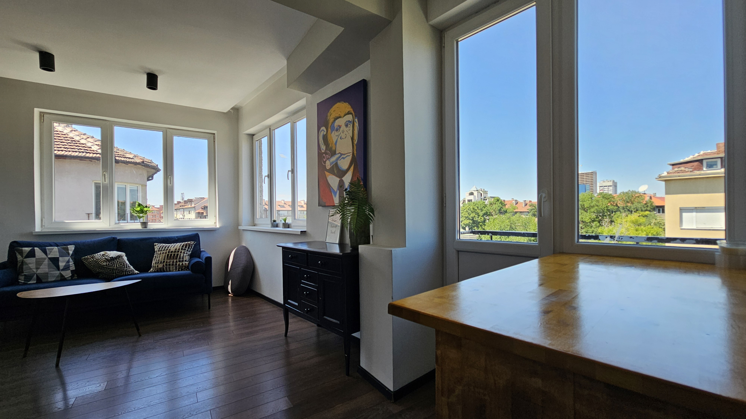 Модерно обзаведен тристаен апартамент, разположен на удобно и комуникативно място в сърцето на града до НДК и пешеходната част на бул. Витоша. С площ от 71 кв.м. апартаменът е функционално разделен на: отворена и светла дневна зона с интегрирана оборудвана кухня, две просторни спални включващи гардероб и климатик, съвременна и стилна баня, оборудвана с всички необходими удобства и тераса- перфектното място за отдих с хубава гледка.