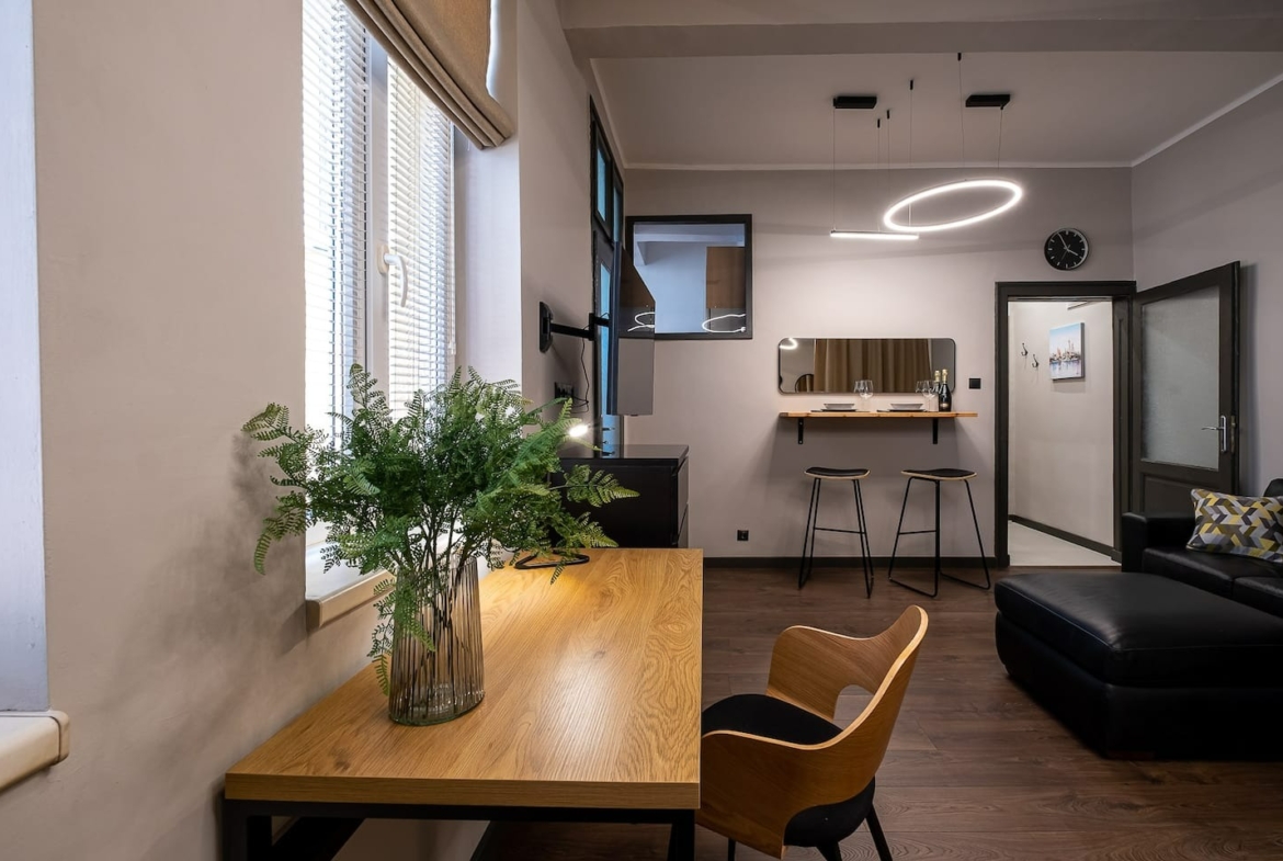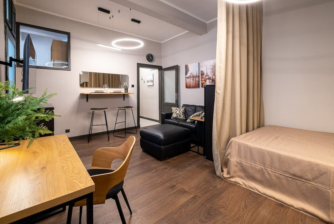 Модерен, елегантен и стилен едностаен апартамент тип студио с площ от 40 кв.м., разположен в идеалния център на София- ул. Екзарх Йосиф. Жилището представлява едно общо помещение, умело разпределено на функционални зони. Всекидневната е обзаведена с удобна мека мебел, а спалният кът предлага комфорт и спокойствие. Кухнята е напълно оборудвана с всички необходими уреди и аксесоари, а модерната баня с тоалетна завършва усещането за функционалност и удобство. Апартаментът е изцяло обзаведен.