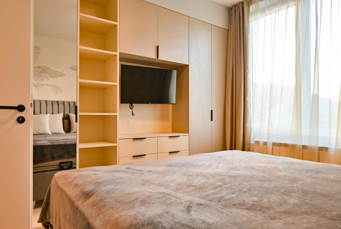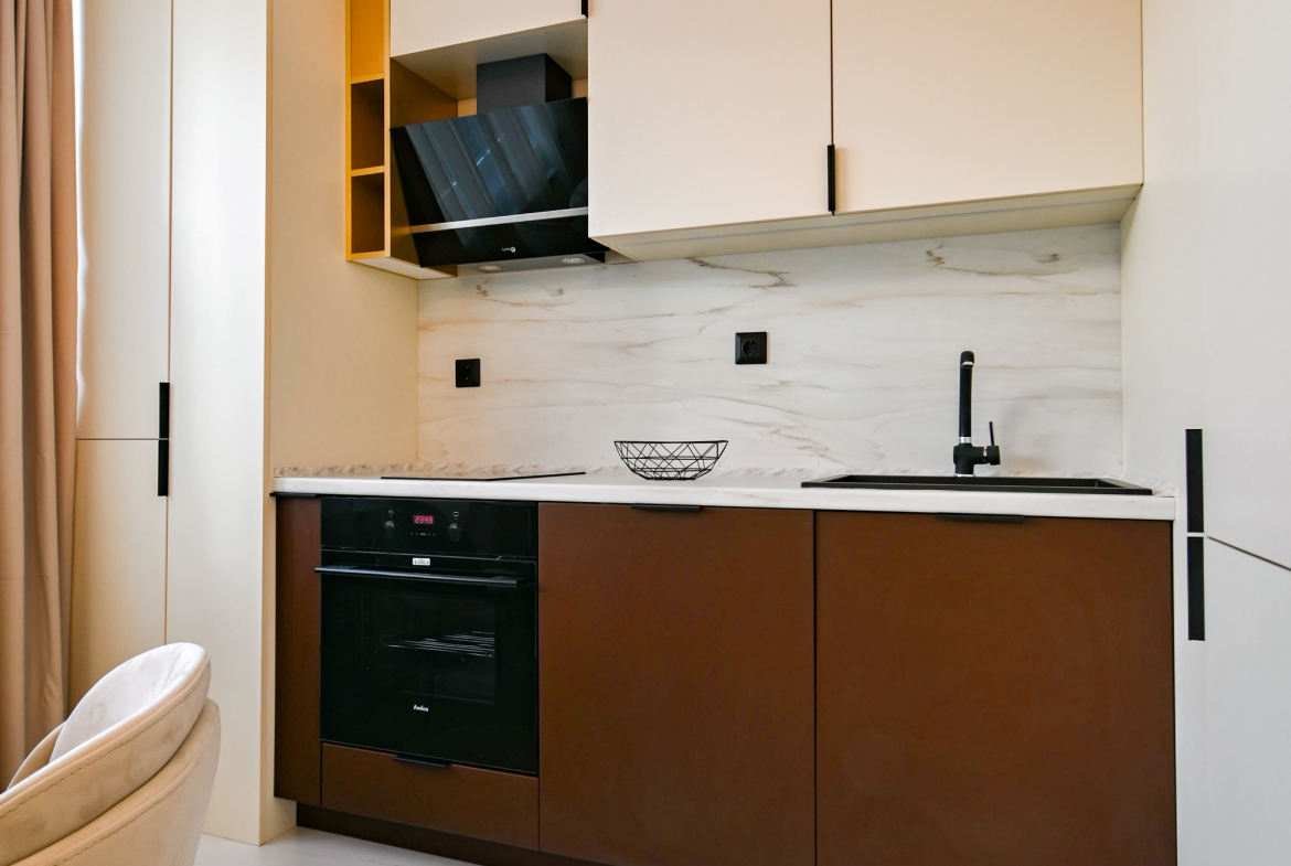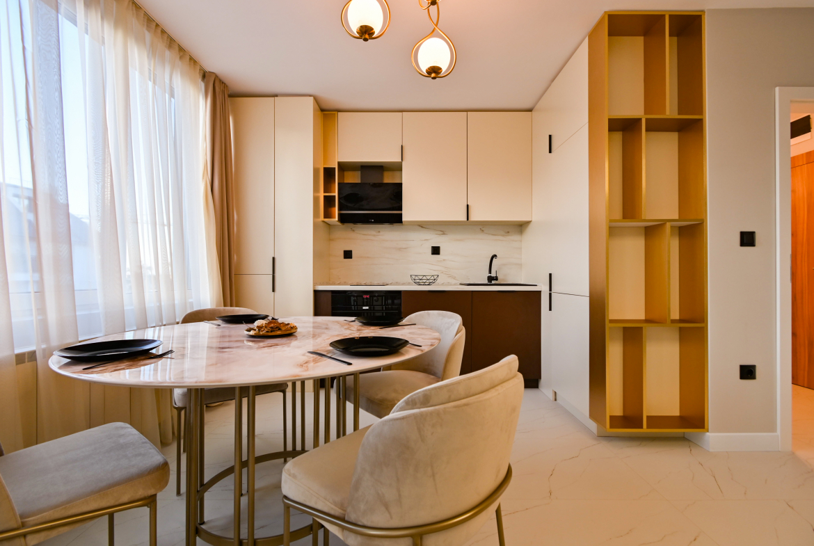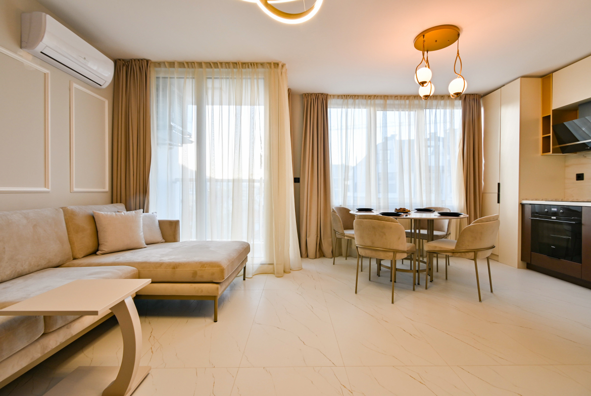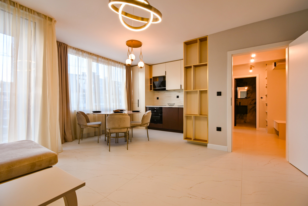 Привлекателен двустаен апартамент в нов комплекс, отличаващ се с модерен дизайн и обща площ от 68 кв.м., функционално разпределена на коридор, просторна кухня с трапезария, уютна спалня, санитарен възел и голям балкон със зелена гледка. Апартаментът е напълно обзаведен с висококачествени мебели и разполага с всички необходими електрически уреди. Интериорът е подбран с внимание към детайлите, съчетавайки комфорт и елегантност.