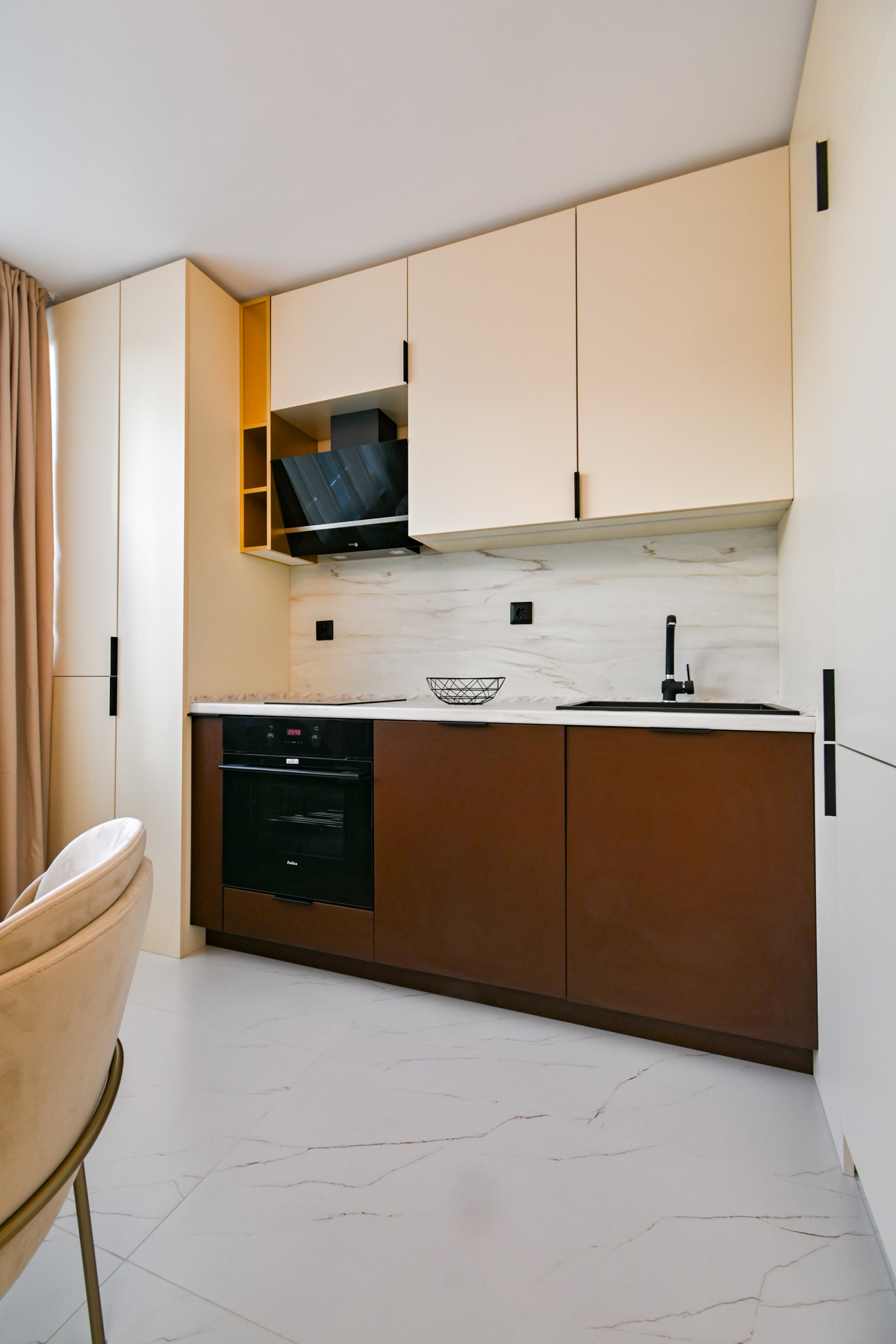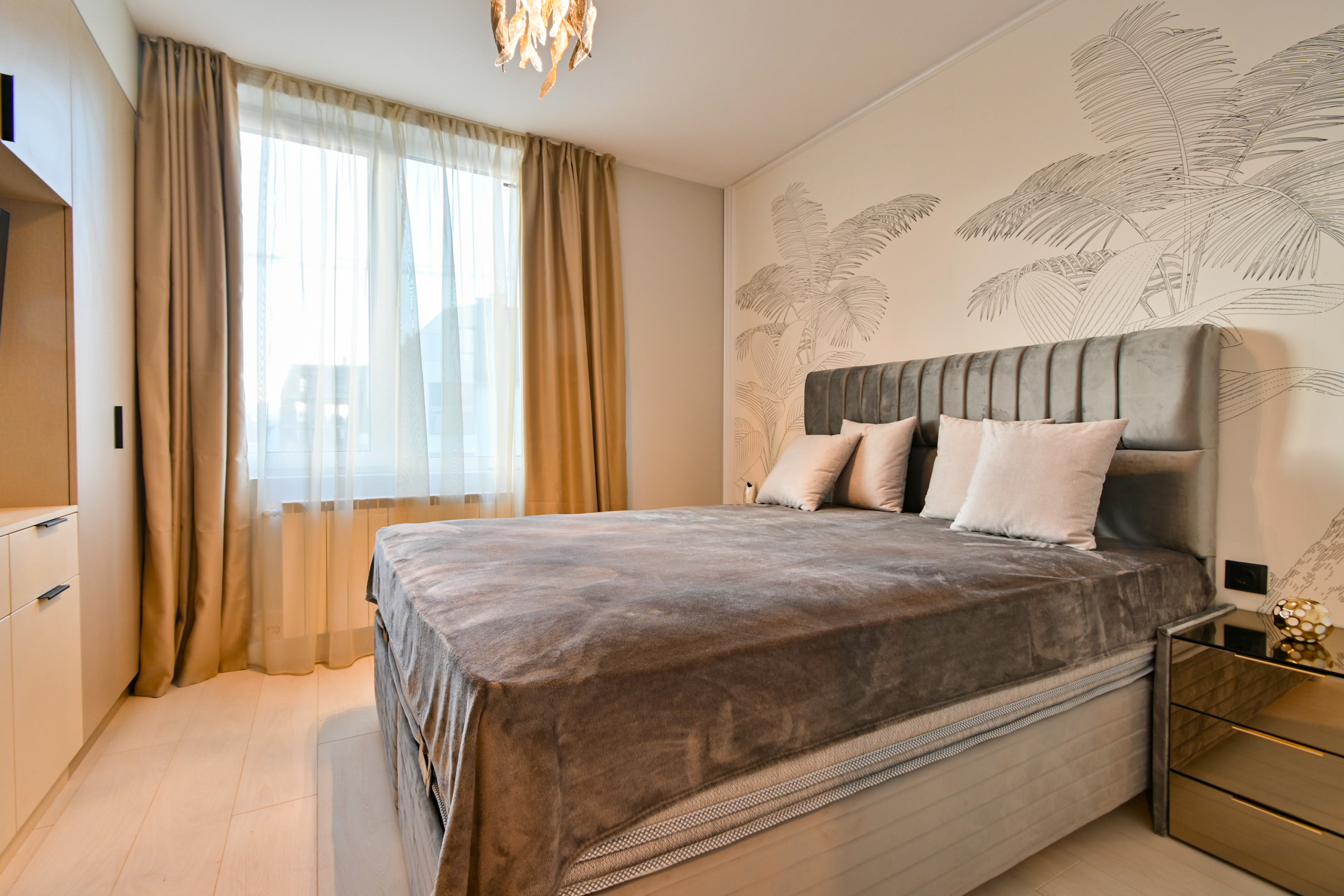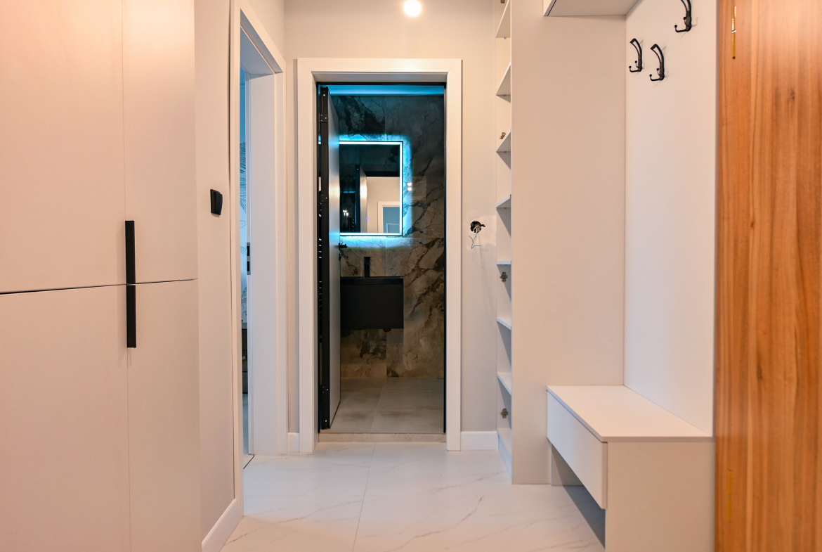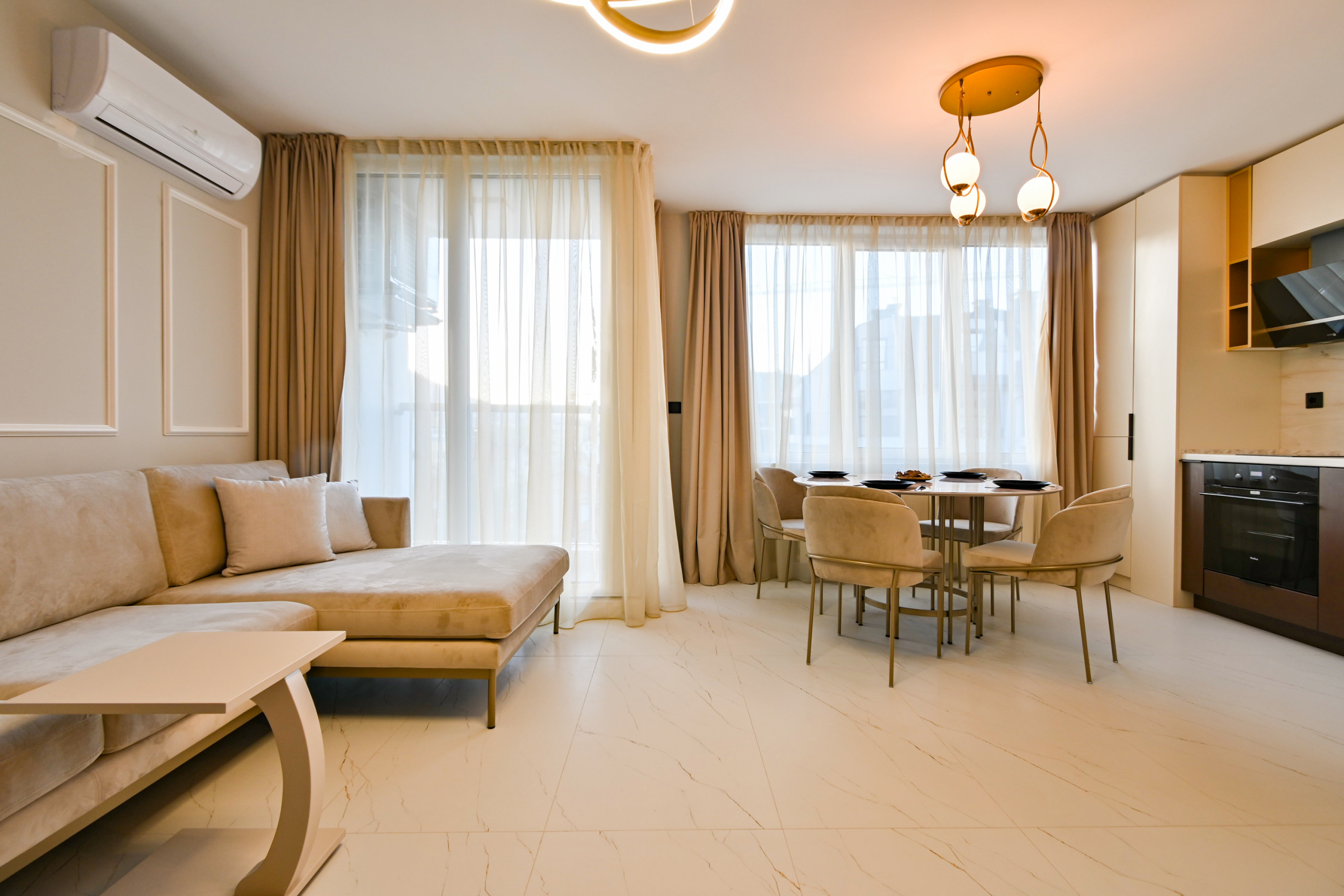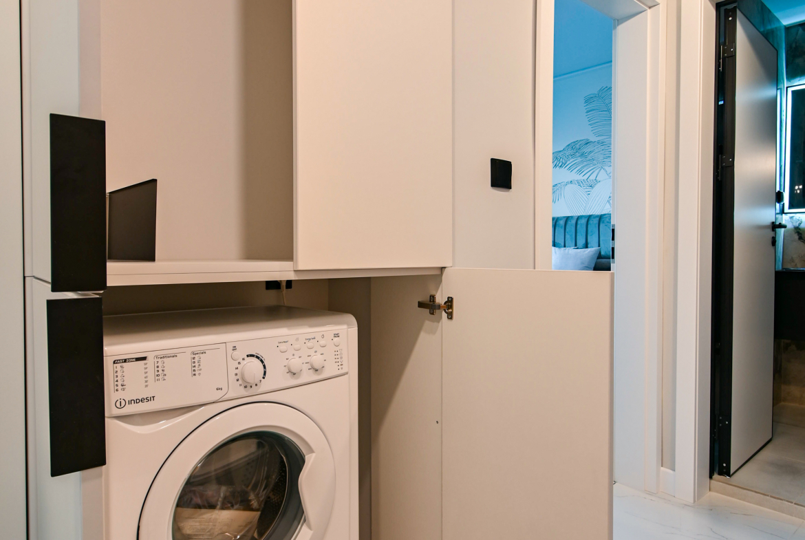 Привлекателен двустаен апартамент в нов комплекс, отличаващ се с модерен дизайн и обща площ от 68 кв.м., функционално разпределена на коридор, просторна кухня с трапезария, уютна спалня, санитарен възел и голям балкон със зелена гледка. Апартаментът е напълно обзаведен с висококачествени мебели и разполага с всички необходими електрически уреди. Интериорът е подбран с внимание към детайлите, съчетавайки комфорт и елегантност.
