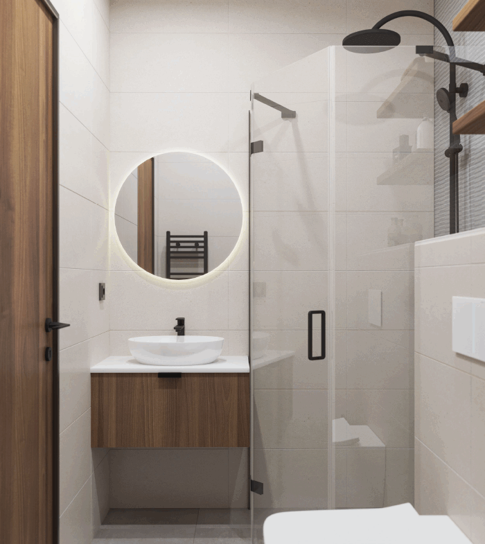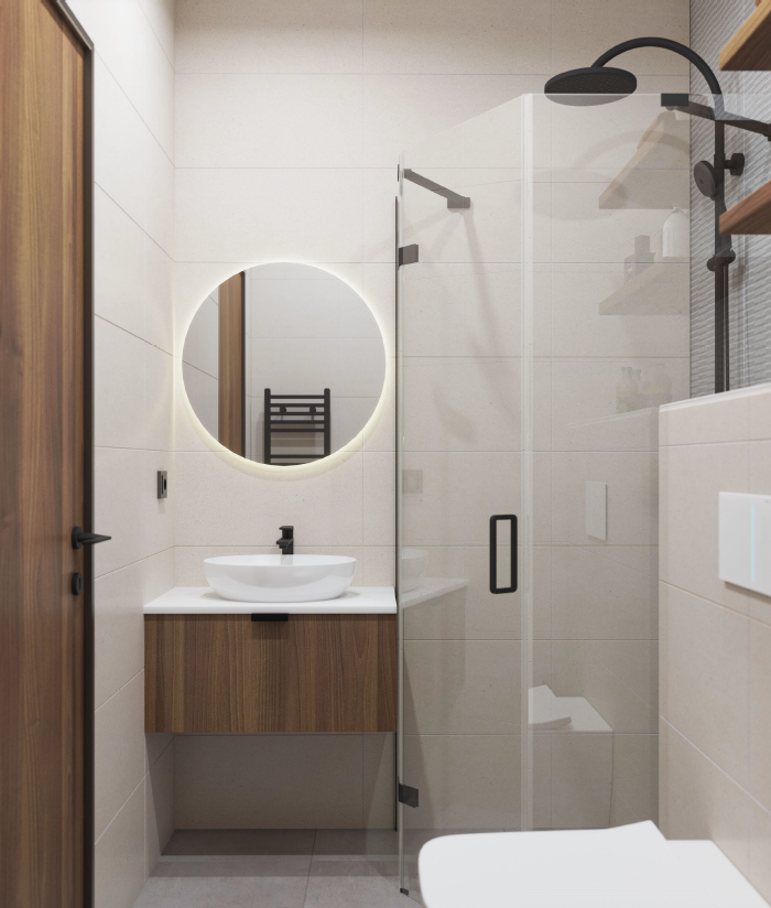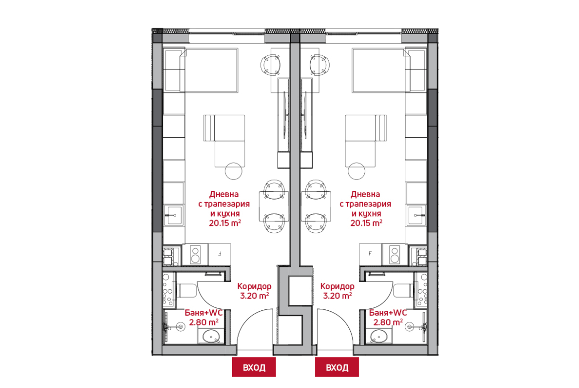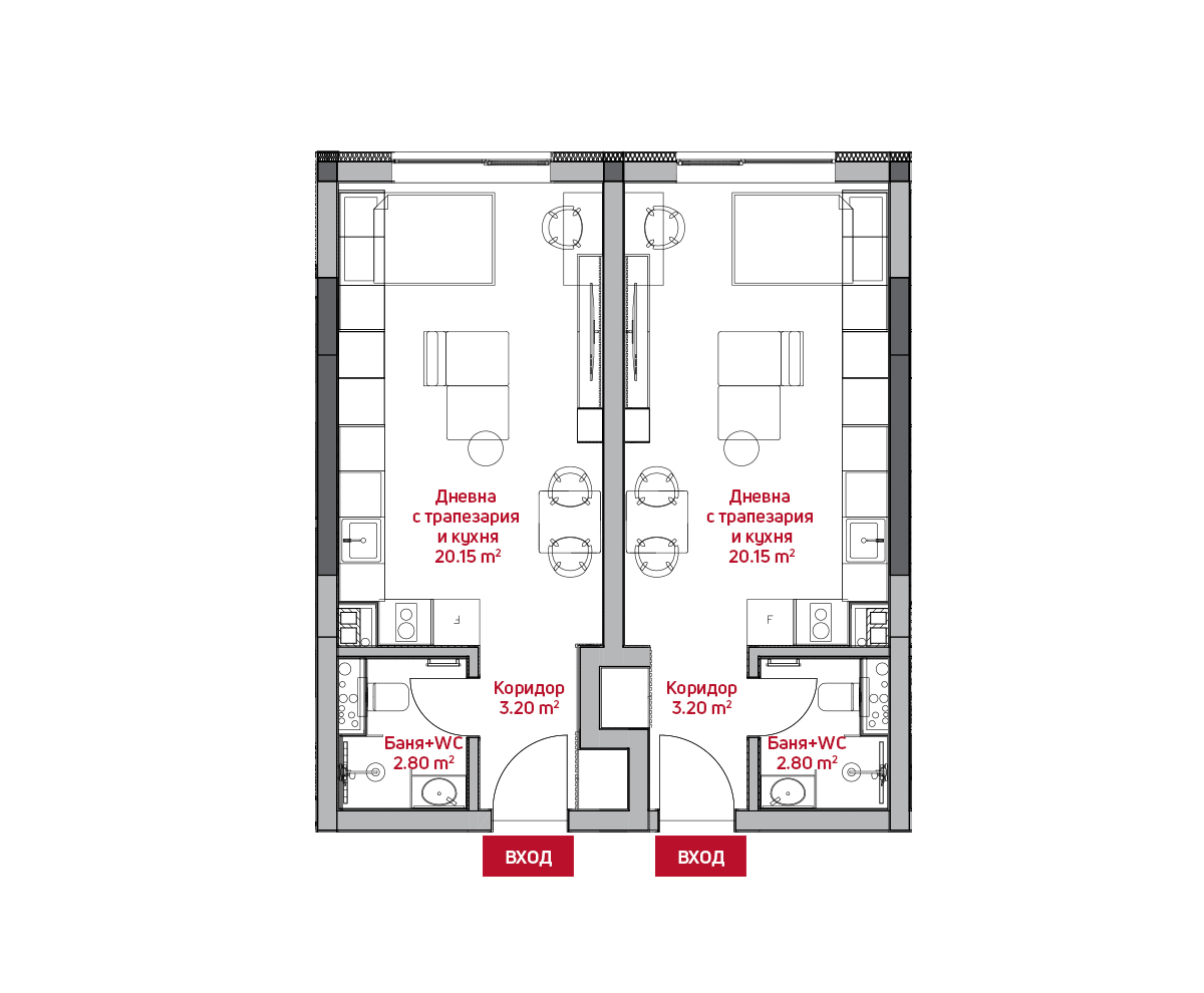 Всеки от двата идентични едностайни апартамента е проектиран за максимално ефективно използване на пространството: Коридор: 3.20 кв.м., Общо помещение: 20.15 кв.м., включващо всекидневна със спален кът, трапезария и кухня, Баня с тоалетна: 2.80 кв.м.